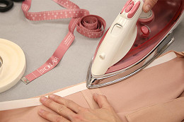 Fixační pásku položte mřížkou na okraj rubové strany lemu. Přes papír zažehlete žehličkou na 100 °C 15 sekund. Poté papírovou pásku odstraňte, lem zahněte a opět zažehlete. Zažehlování doporučujeme provádět přes další látku - např. kapesník. Vyhnete se tak lesklým obtiskům, které někdy žehlička na jemných látkách způsobí. Doporučujeme to nejdříve vyzkoušet na malém kousku látky.