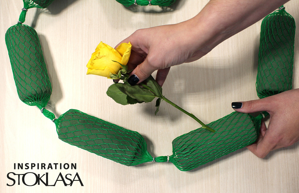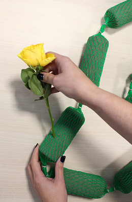 Girlandu z aranžovací hmoty využijete ke tvoření elegantních a kreativních květinových aranžmá. Je určená převážně pro živé květiny, protože dobře zadržuje vodu. Umožňuje umístit květiny do libovolného prostoru, například na stoly, slavobrány, schodiště nebo okna, a proměnit tak běžné prostředí v nádherné květinové scenérie. Girlandu tvoří 14 válečků o průměru 5 cm a délce 13 cm. Lze ji stíhat na potřebnou délku, válečky jsou oddělené mezi sebou tak dobře, že se nerozpadnou.