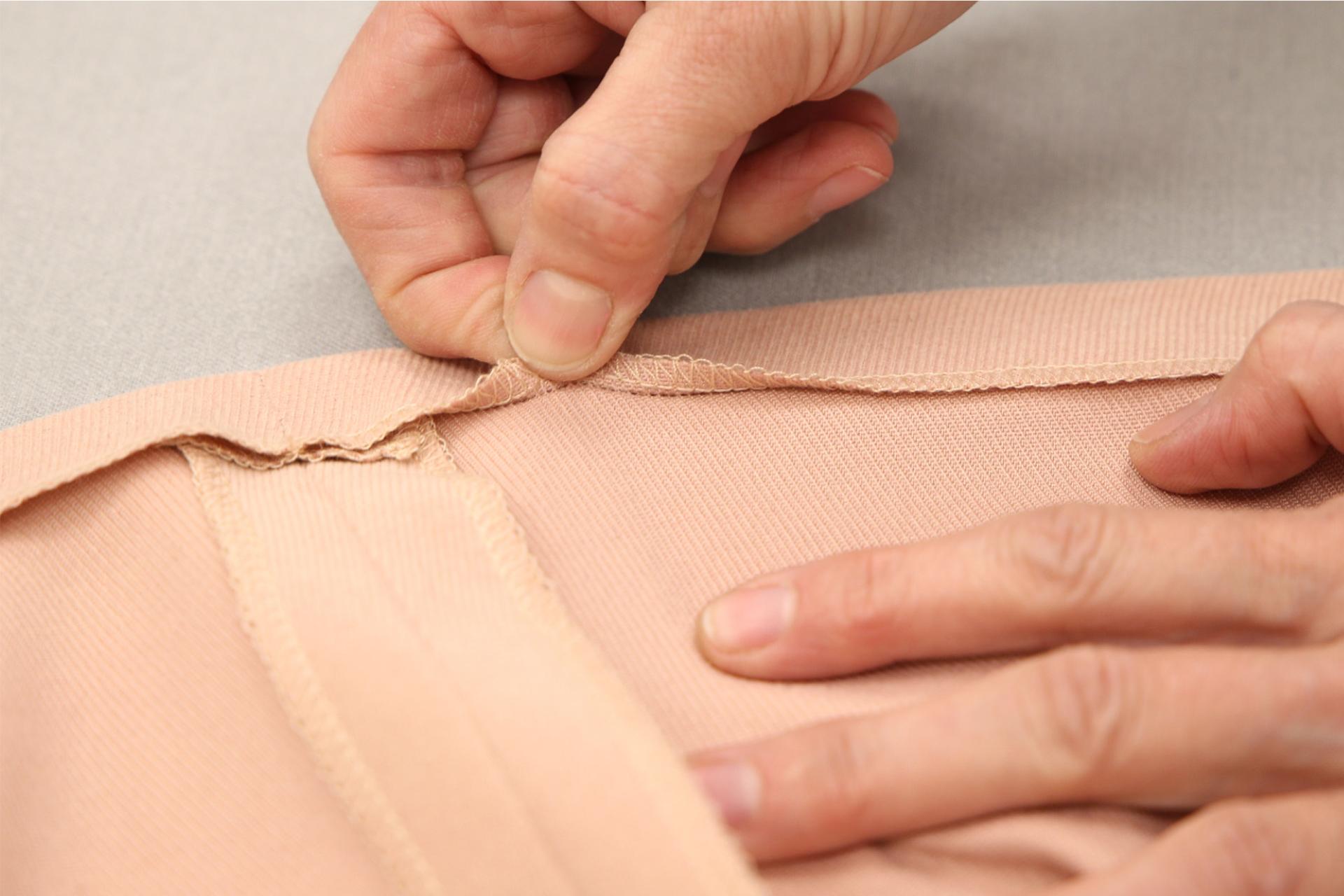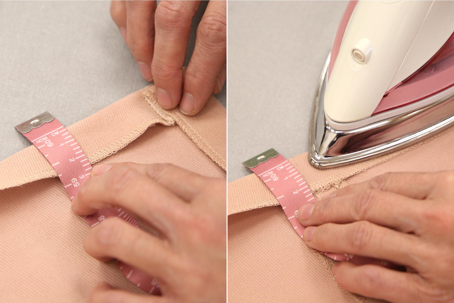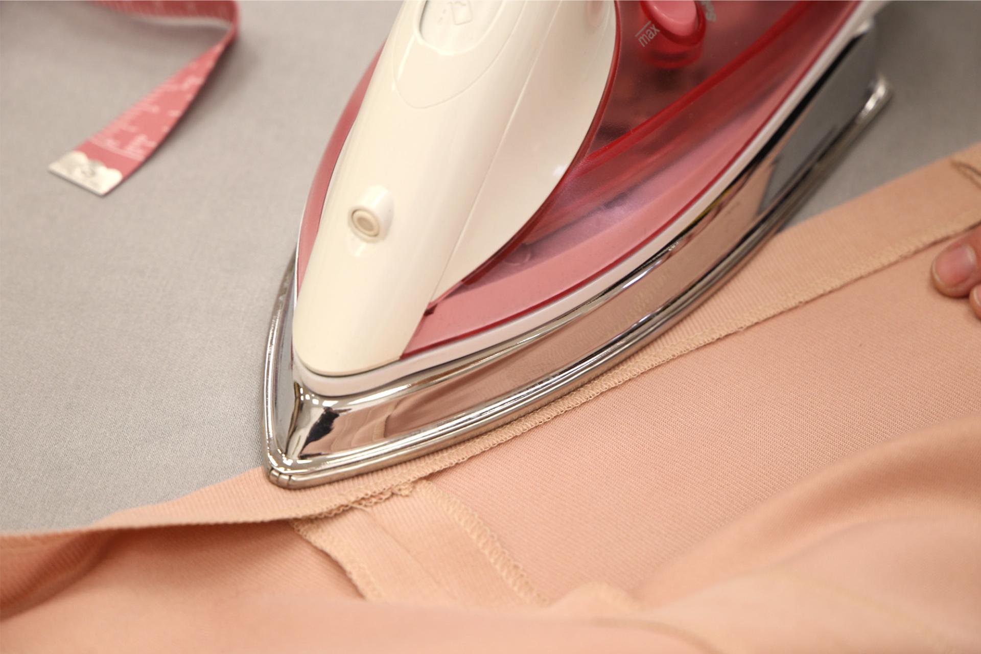 2. Okraj textilie (v našem případě okraj sukně) s nažehleným proužkem přehneme na požadovanou šířku záložky a přežehlíme po celém obvodu.