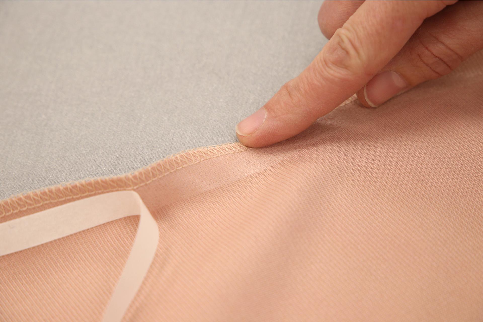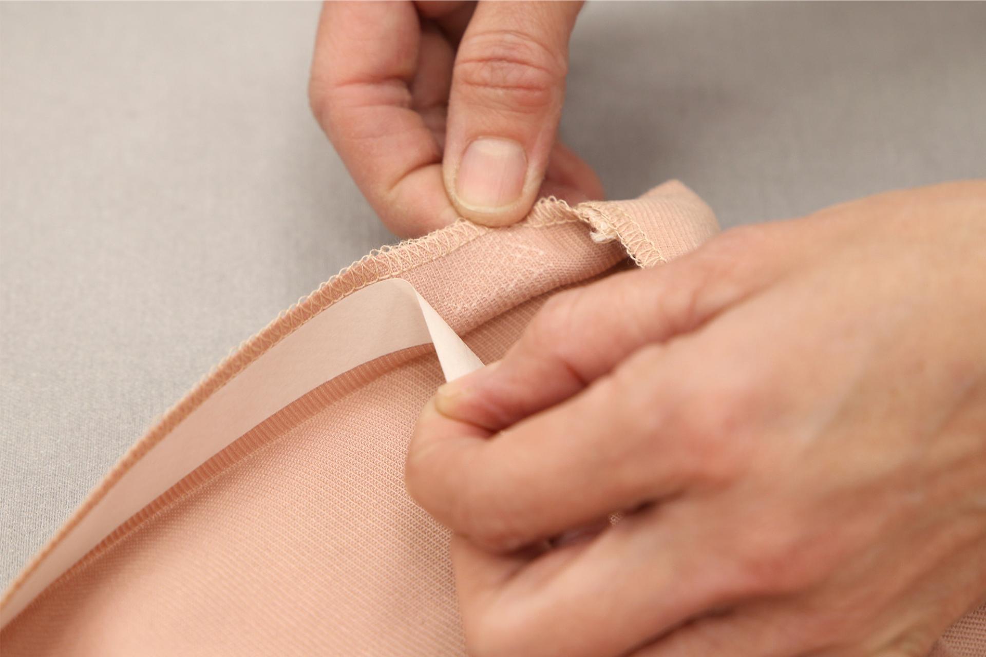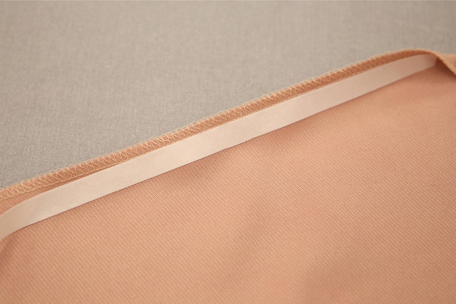 1. Rozložíme si textilii a na její rub přiložíme lepidlem dolů fixační pásku. Přes krycí papír přežehlíme žehličkou. Doporučujeme bez páry, na teplotu 100 °C, cca 15 s. Po nažehlení krycí papírový proužek ještě nesundáváme!