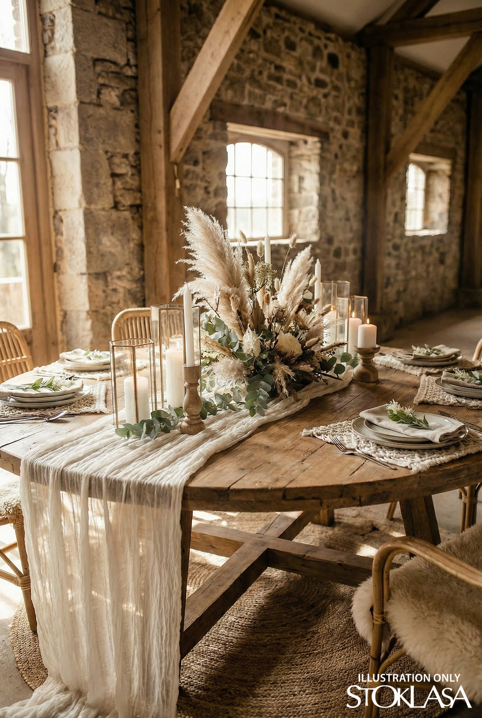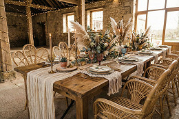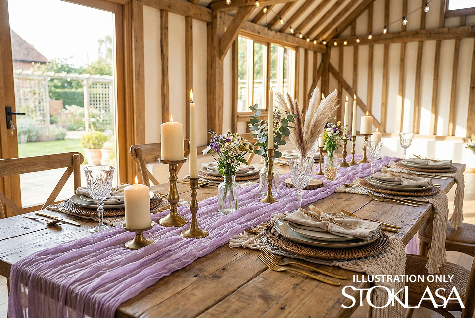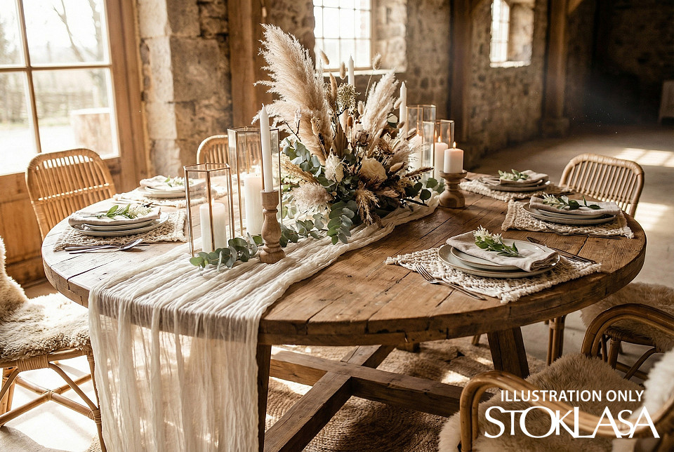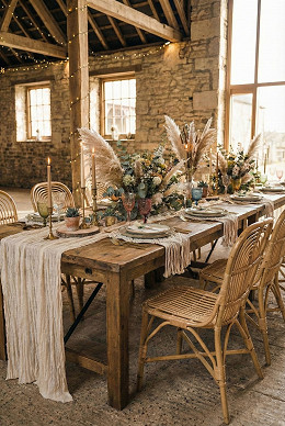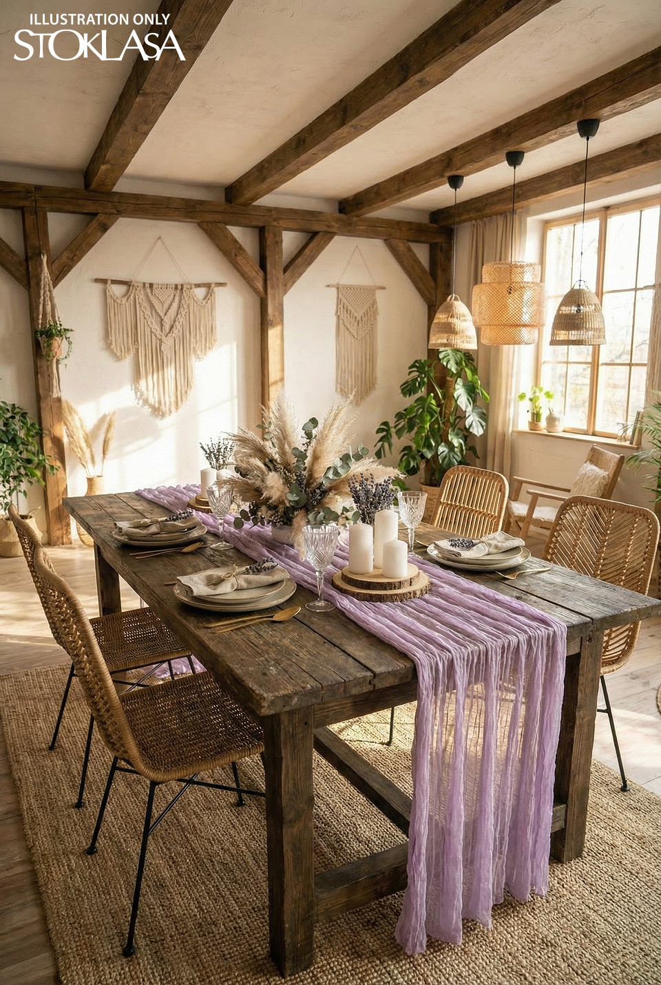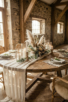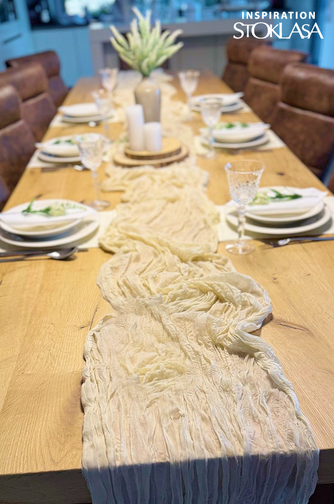 Slavnostní mačkaný běhoun ve stylu boho je elegantní dekorací, která poslouží k ozdobení středové části stolu. Jeho jednoduchý vzhled a průsvitný materiál, v kombinaci s přírodními tóny, dokonale zapadne do atmosféry boho stylu. Kvalitní materiál zajišťuje příjemnou texturu a vzhled, který působí lehce a vzdušně. Využijete ho na různých oslavách a svatbách, kterým dodá harmonickou atmosféru. Může být i ozdobou pro předsvatební hostinu, recepci, party či jiné typy oslav, kde chcete vytvořit nezapomenutelnou atmosféru.