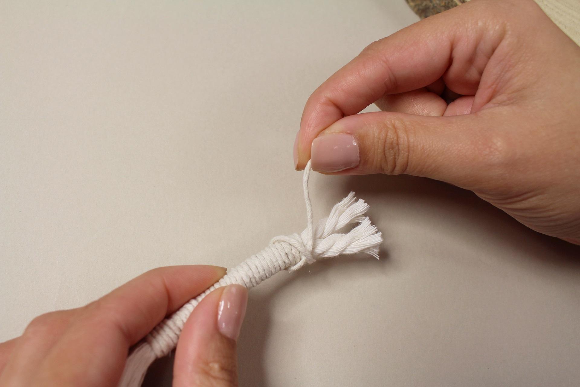 5. Konec provázku zajistíme uzlíkem, aby se omotání nerozvázalo. Takto si připravíme i další 4 šňůry, které budou tvořit obloučky hvězdy.