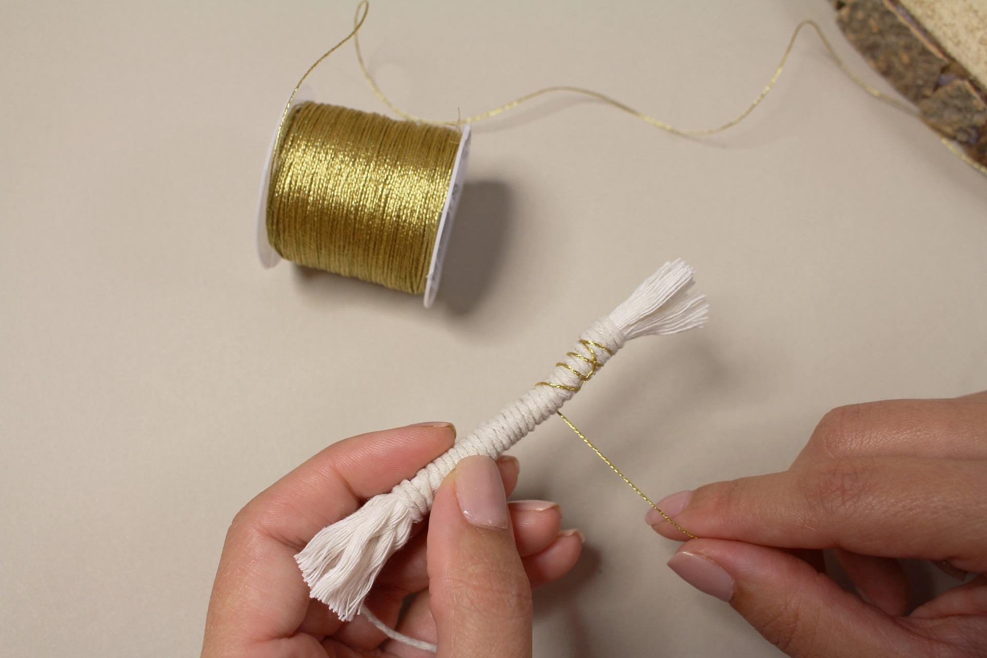 7. Až dojdeme ke konci omotané části, přiložíme další připravenou omotanou šňůru a spojíme je k sobě zlatou nití.