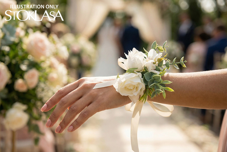 Romantický náramek s květy růží je určený především pro svědkyni, družičku, maminku nebo jen tak. Potěší všechny ženy, které se rády zdobí poetickými doplňky. Pomocí saténové stuhy se uváže okolo zápěstí, má univerzální velikost. Květy jsou doplněné zelenými větvičkami a lístky a mašličkou. Náramek je nejen krásným doplňkem, ale také památkou na výjimečné okamžiky. Je perfektní na živo i na fotografiích. Průměr růžiček je cca 5 cm, rozměr celé květinové ozdoby je cca 11 - 15 cm. Stuhy jsou dlouhé cca 40 cm.