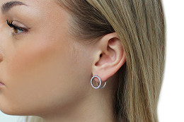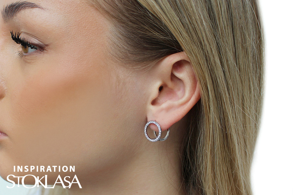 Náušnice zdvojené kroužky z kvalitní nerezové oceli skvěle doplní byznys styl oblékání, jeansovou módu, ležérní outfity i slavnostní šaty. Přední kroužek z náušnice je ozdobený třpytivými broušenými kamínky, zadní kroužek za uchem je hladký. Povrch náušnic má zrcadlový lesk.