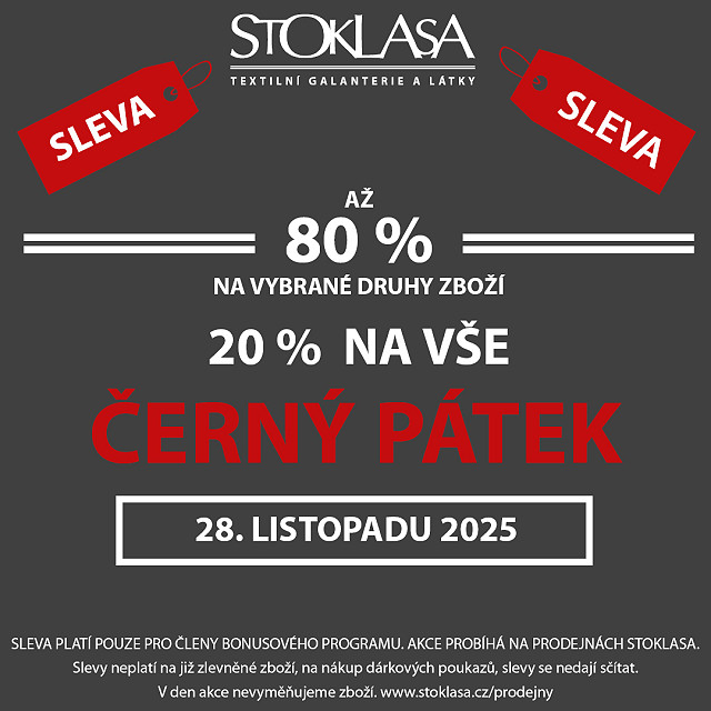Využijte akci Černý pátek a nakupte v prodejnách Stoklasa s 20% slevou! Na vybrané zboží navíc platí sleva až 80 %. Pouze v pátek 28. 12. 2025
