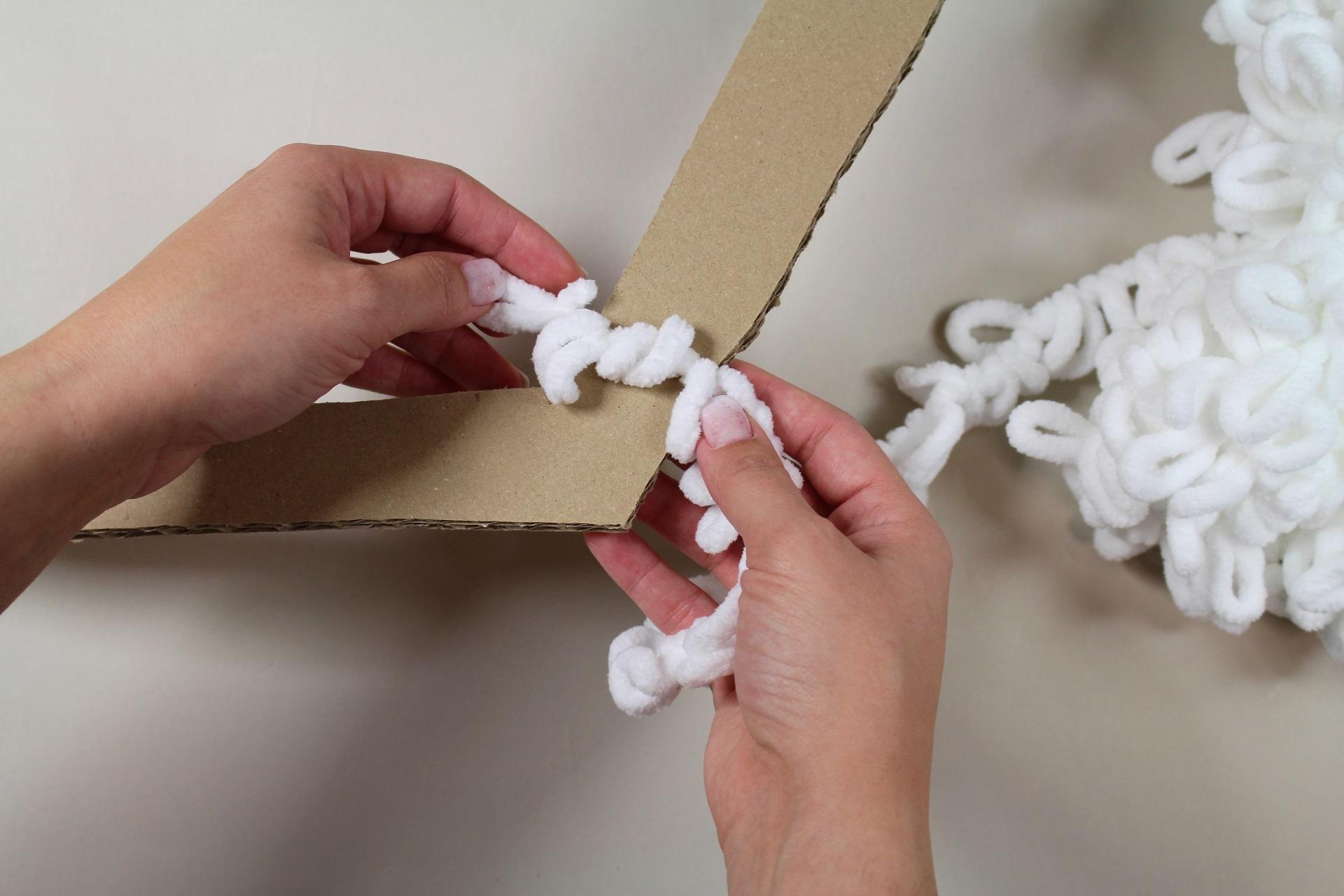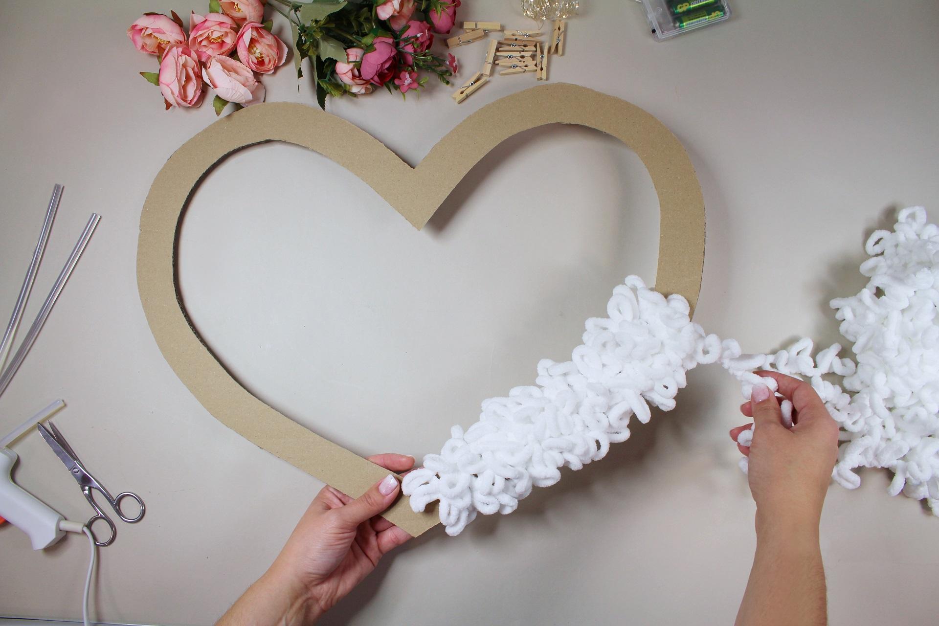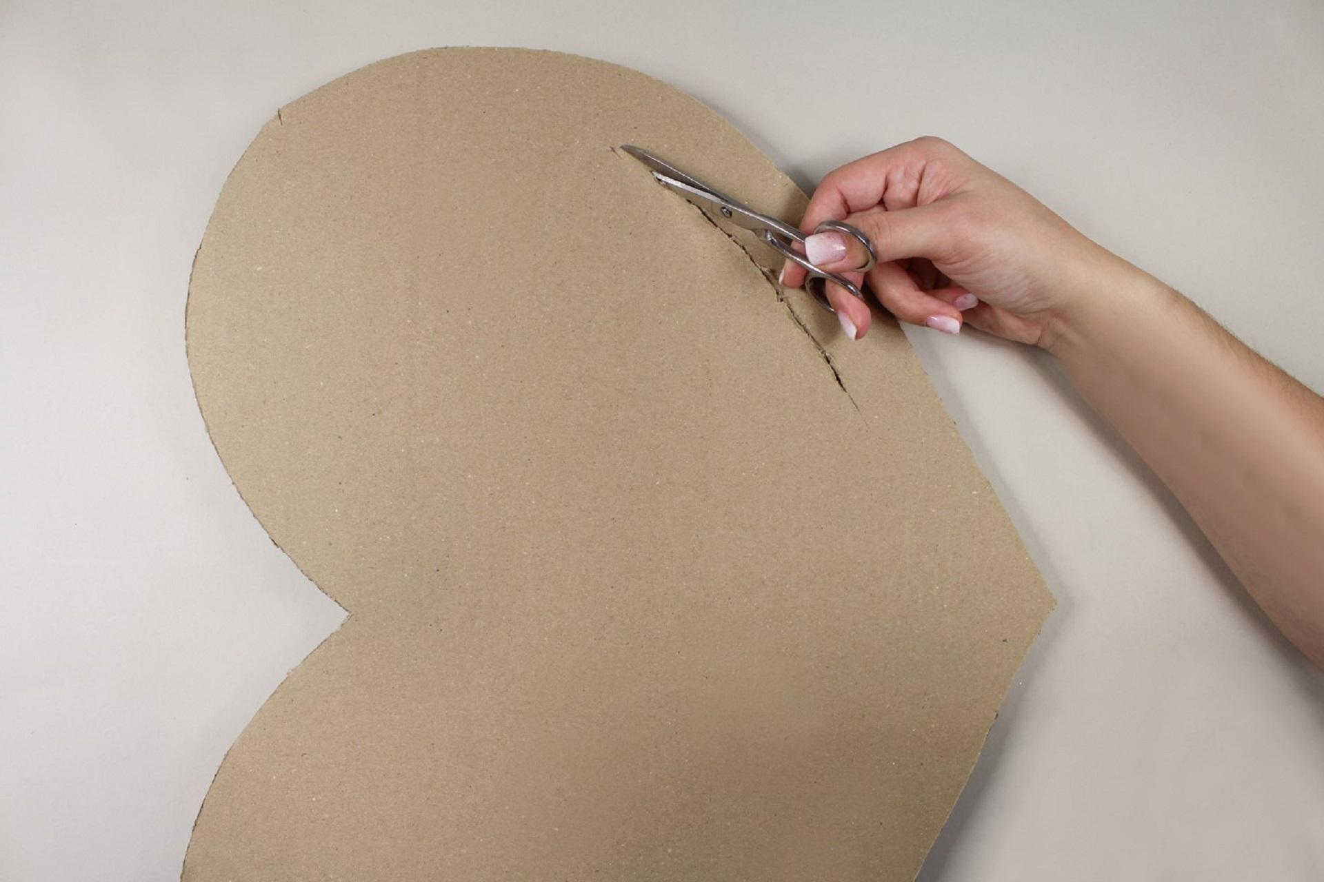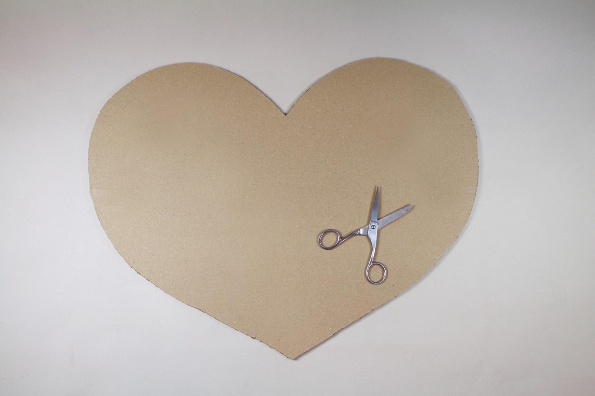 1. Vystřihneme si z kartonu tvar srdce v požadované velikosti. Naše srdce má velikost přibližně 50 × 40 cm a k jeho výrobě jsme potřebovali 2 klubka Puffy příze.