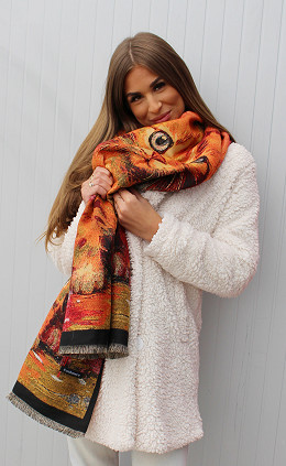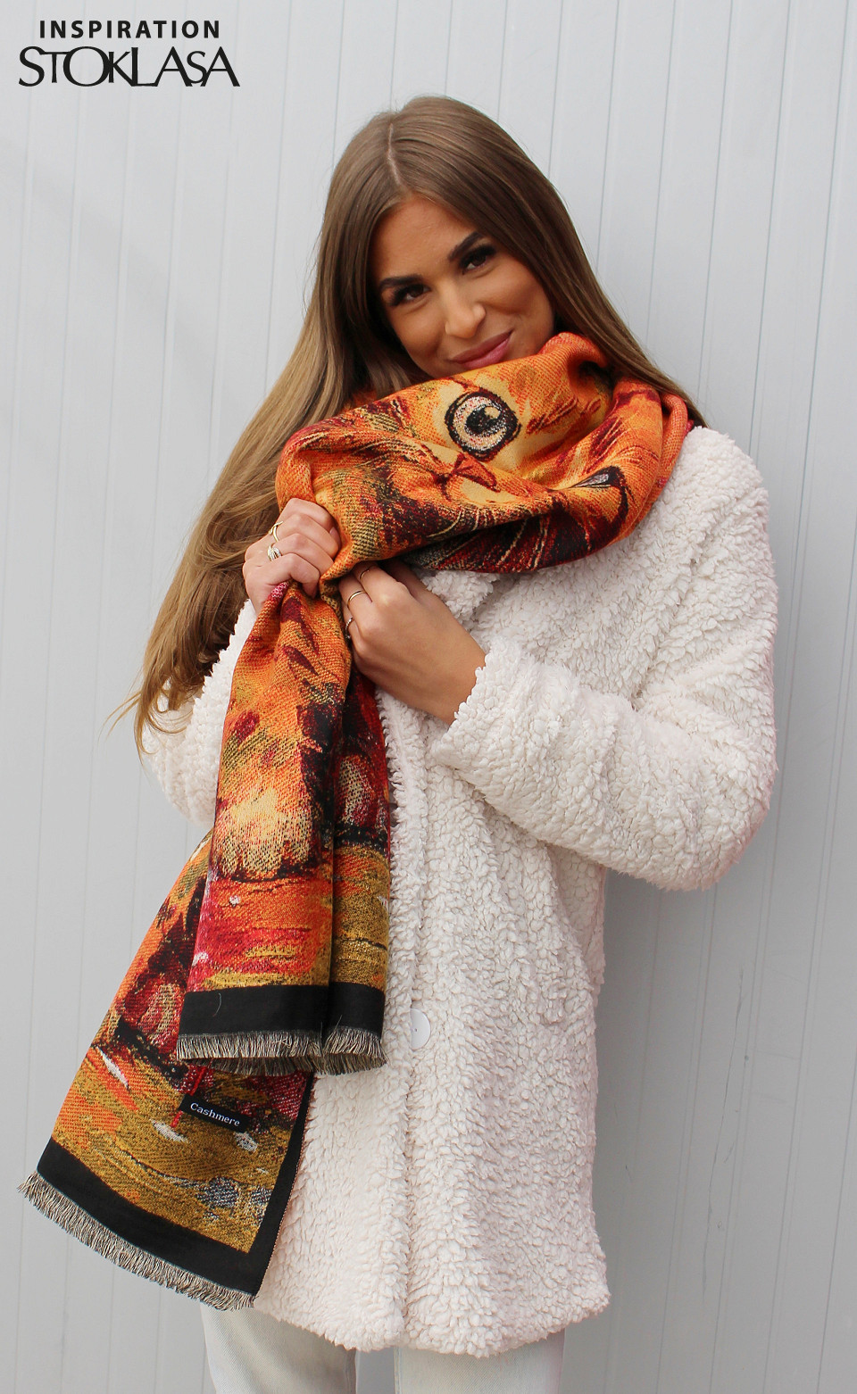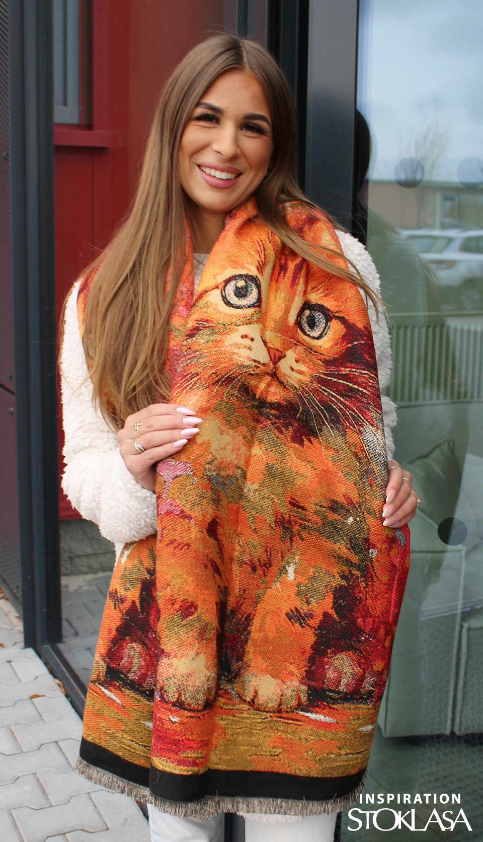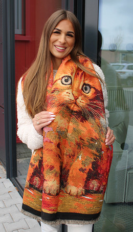 Velká šála typu kašmír je vyrobená z hřejivého materiálu, který je příjemně hebký na dotek. Je ozdobená obrázky různých koček. Krásně vás zahřeje v chladném a sychravém počasí. Na koncích je zakončená krátkými třásněmi.