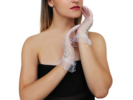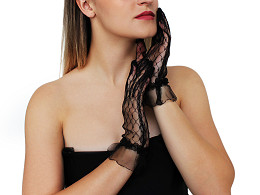 Elegantní krajkové rukavice představují dokonalý doplněk pro každou slavnostní příležitost. Výborně se přizpůsobí své majitelce, zápěstí mají ozdobené volánkem. Díky všité pružence perfektně drží - nesklouzávají. Krátké rukavičky nevyžadují nutně velkou večerní róbu jako jejich dlouhá varianta. Využijete je i při letních večerních party, na čajové dýchánky apod. Jsou ideální na taneční večery. Skvěle doplní večerní šaty nebo koktejlové outfity.