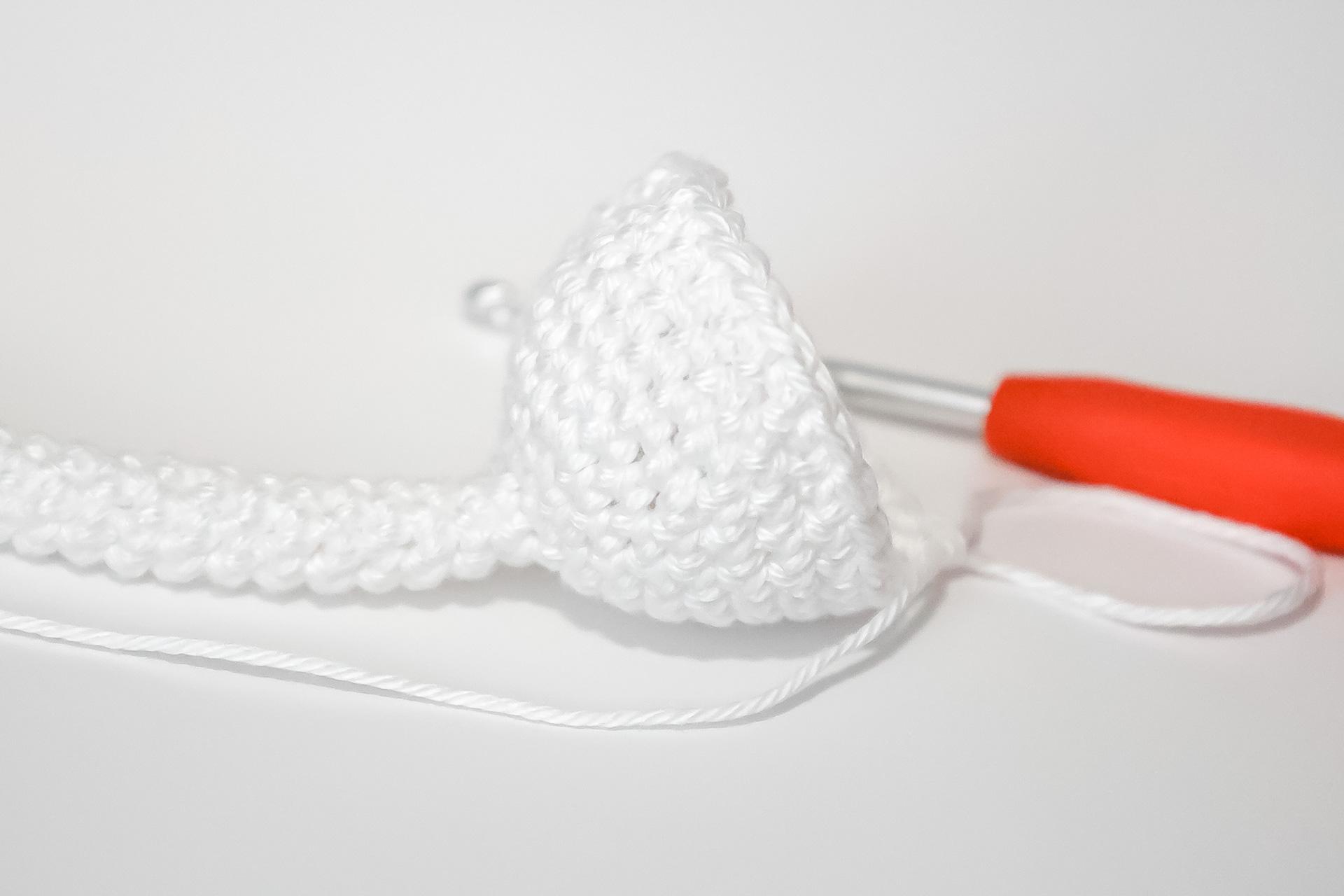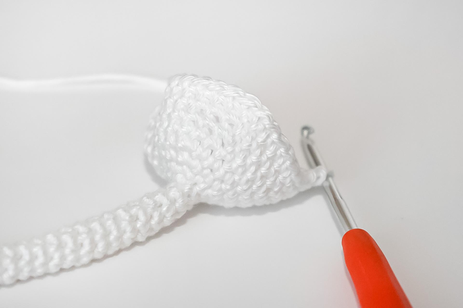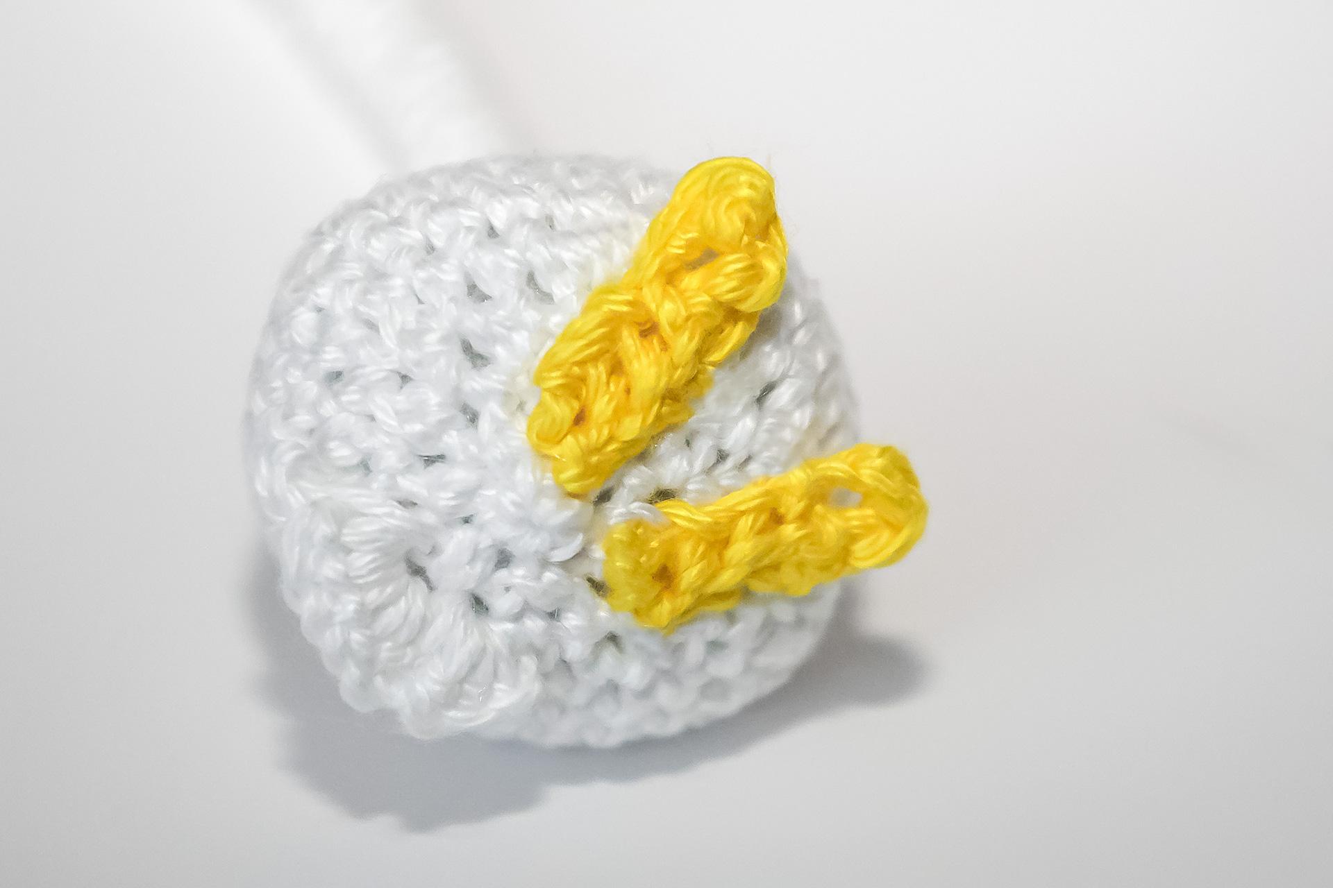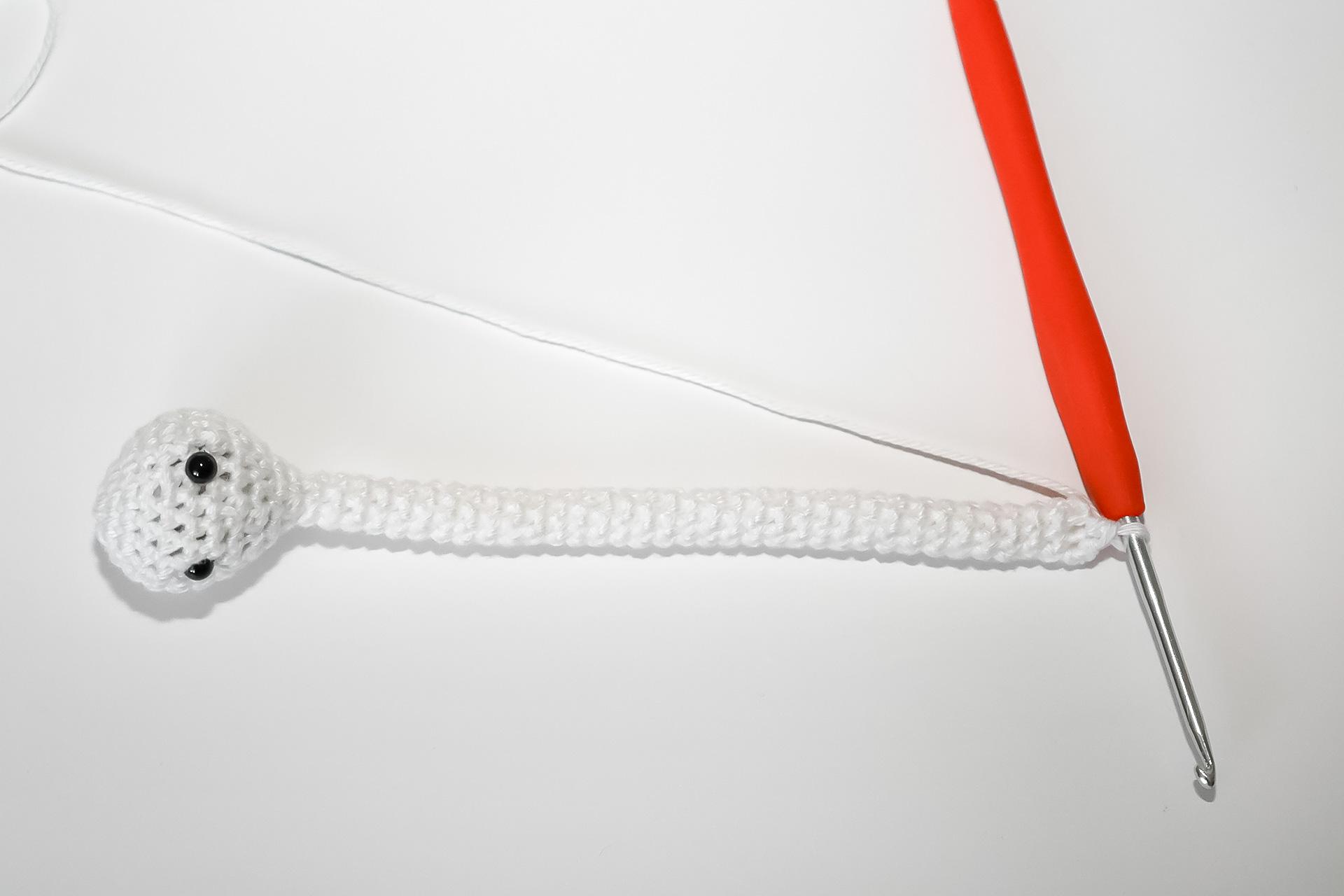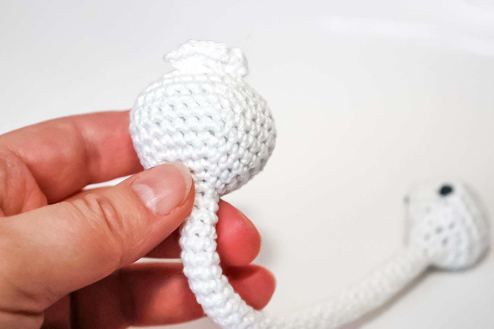 37. Do druhého oka od háčku uháčkujeme 3KS do jednoho oka, dále 3PO, ukončíme a necháme delší přízi na přišití. Doděláme druhou nožku.