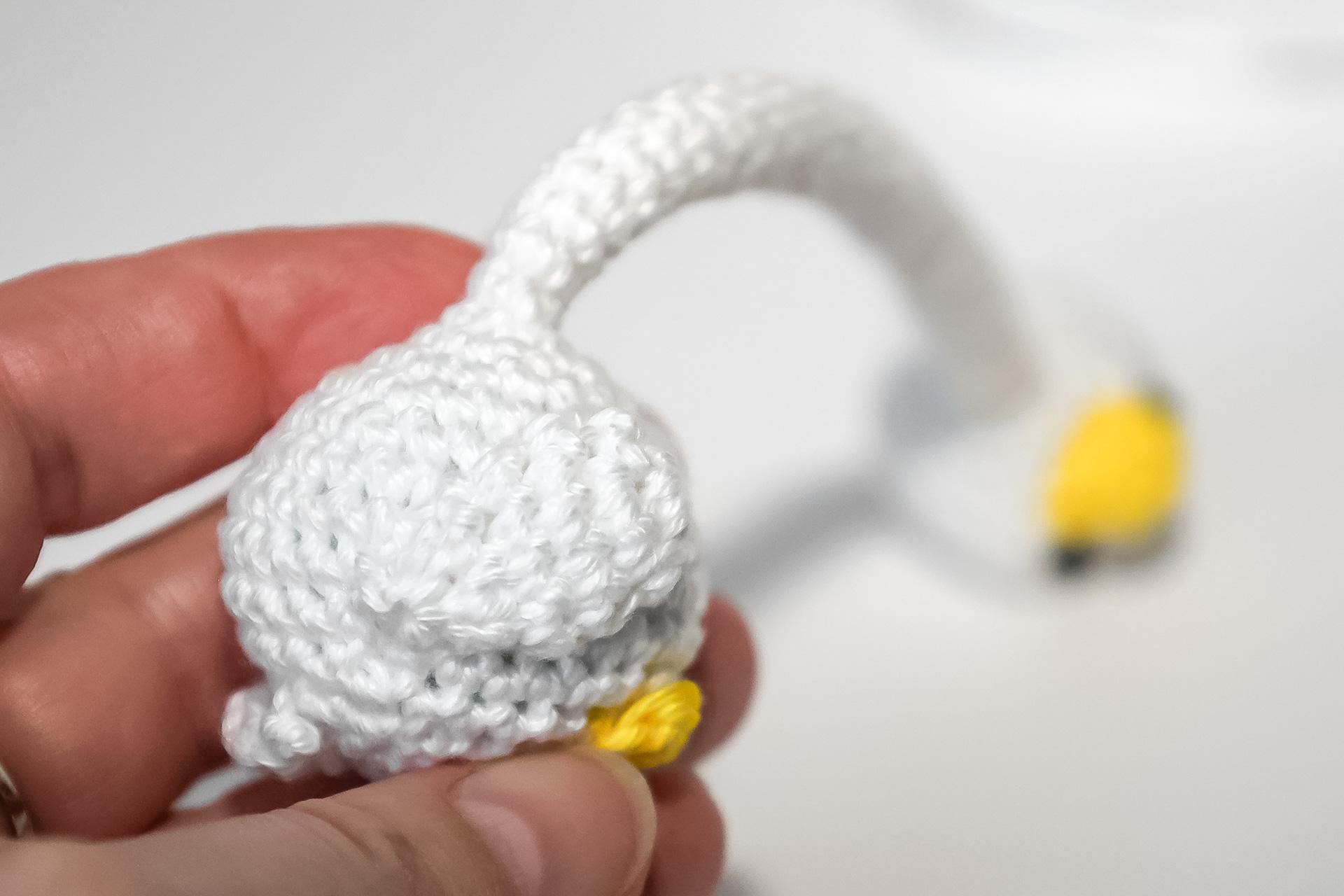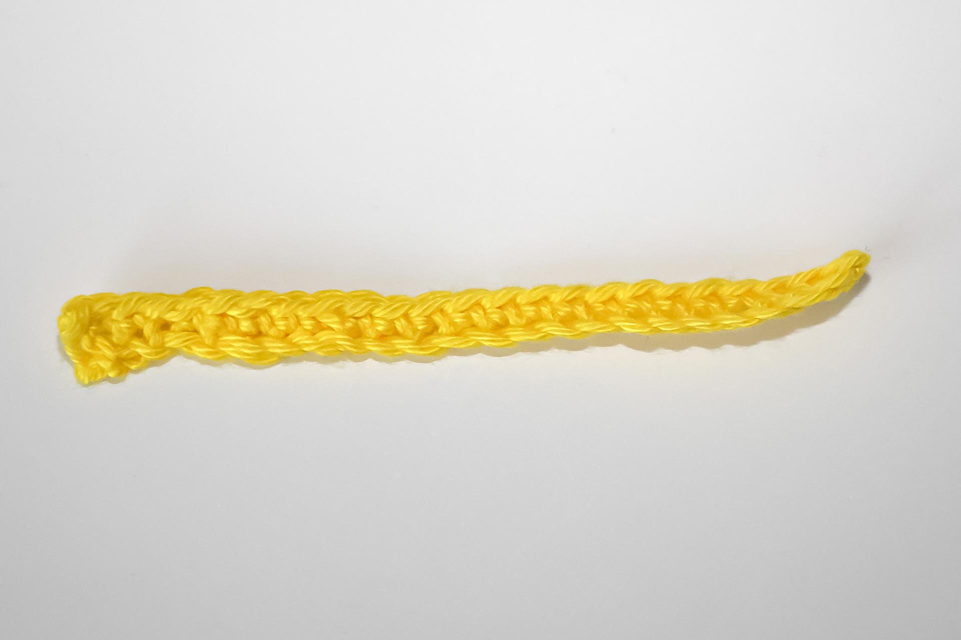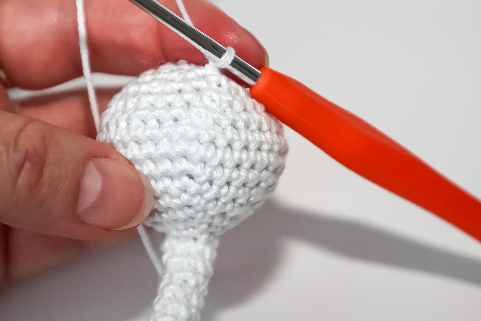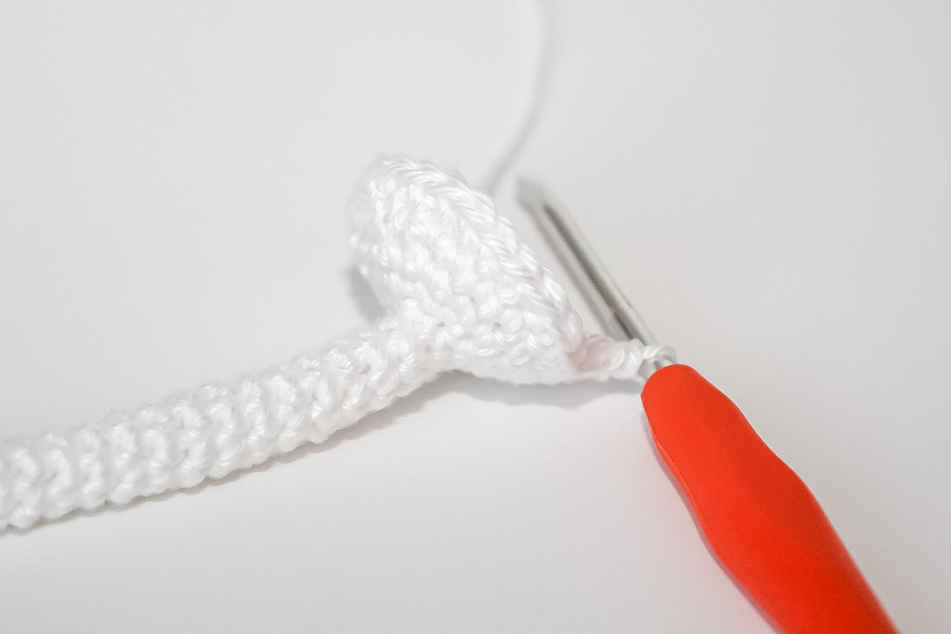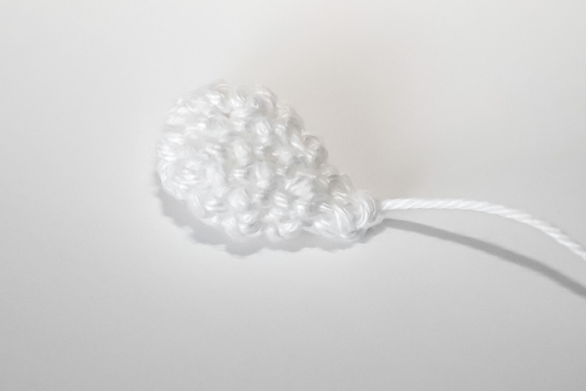 37. Do druhého oka od háčku uháčkujeme 3KS do jednoho oka, dále 3PO, ukončíme a necháme delší přízi na přišití. Doděláme druhou nožku.