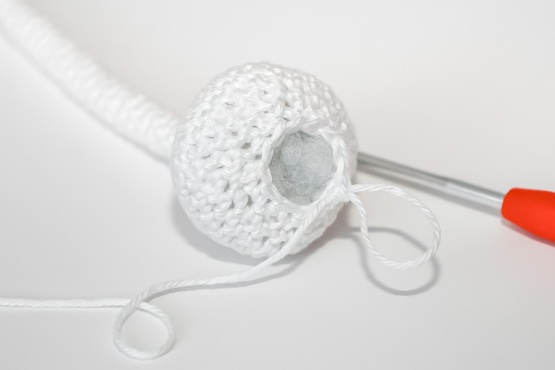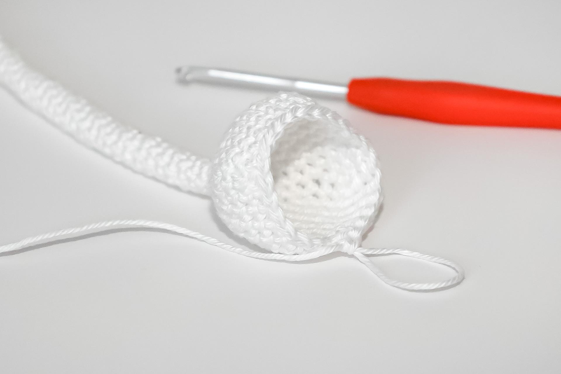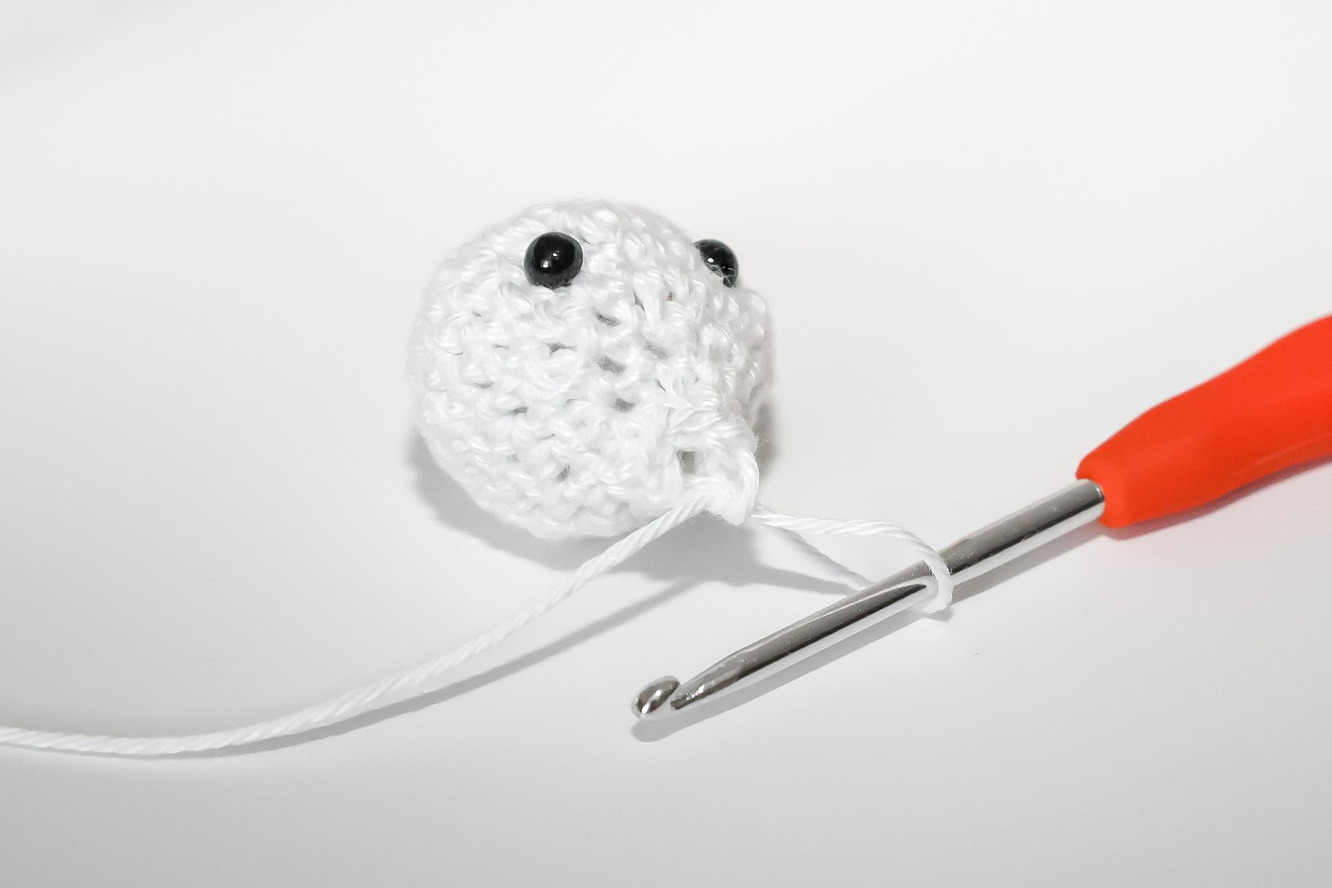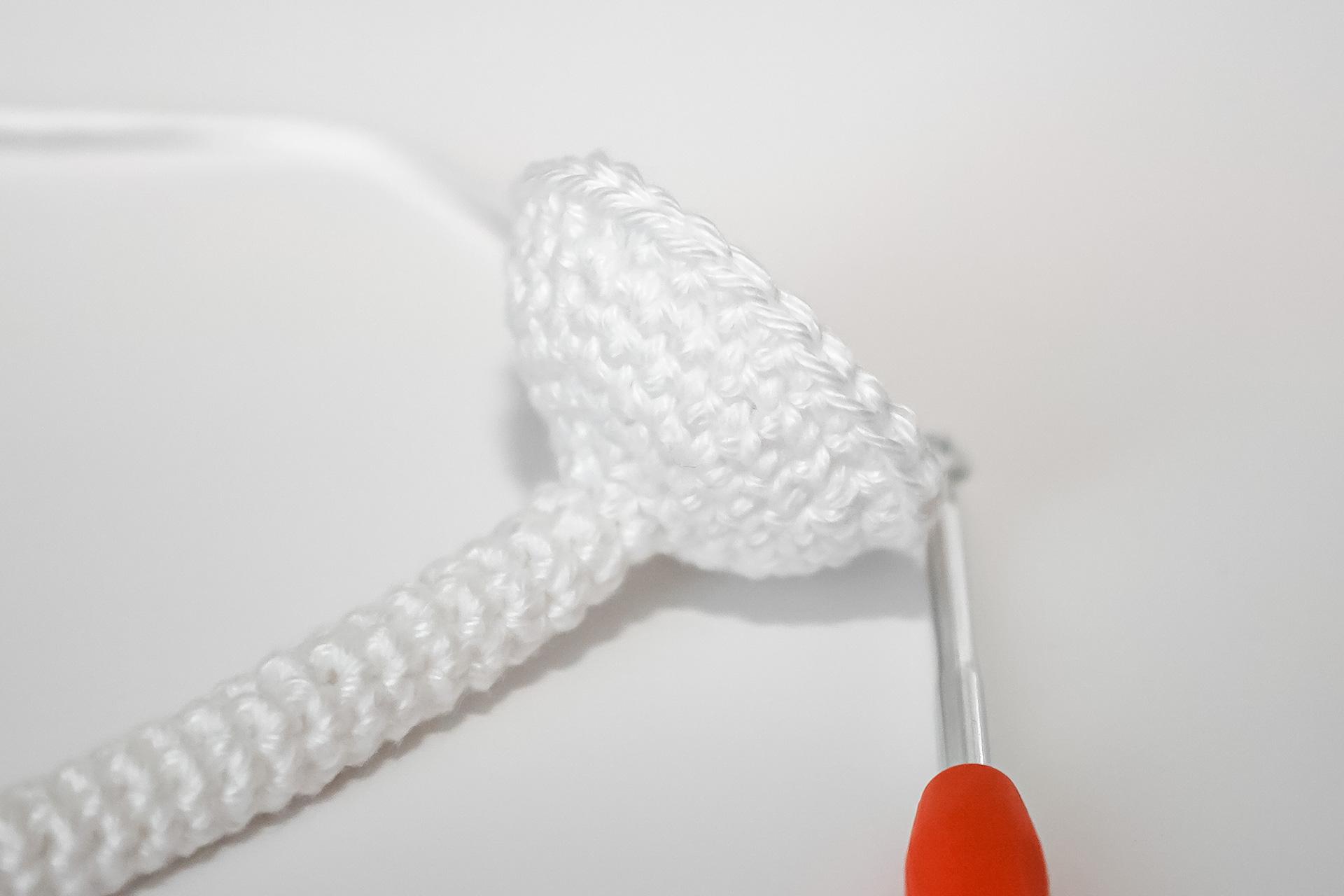 37. Do druhého oka od háčku uháčkujeme 3KS do jednoho oka, dále 3PO, ukončíme a necháme delší přízi na přišití. Doděláme druhou nožku.