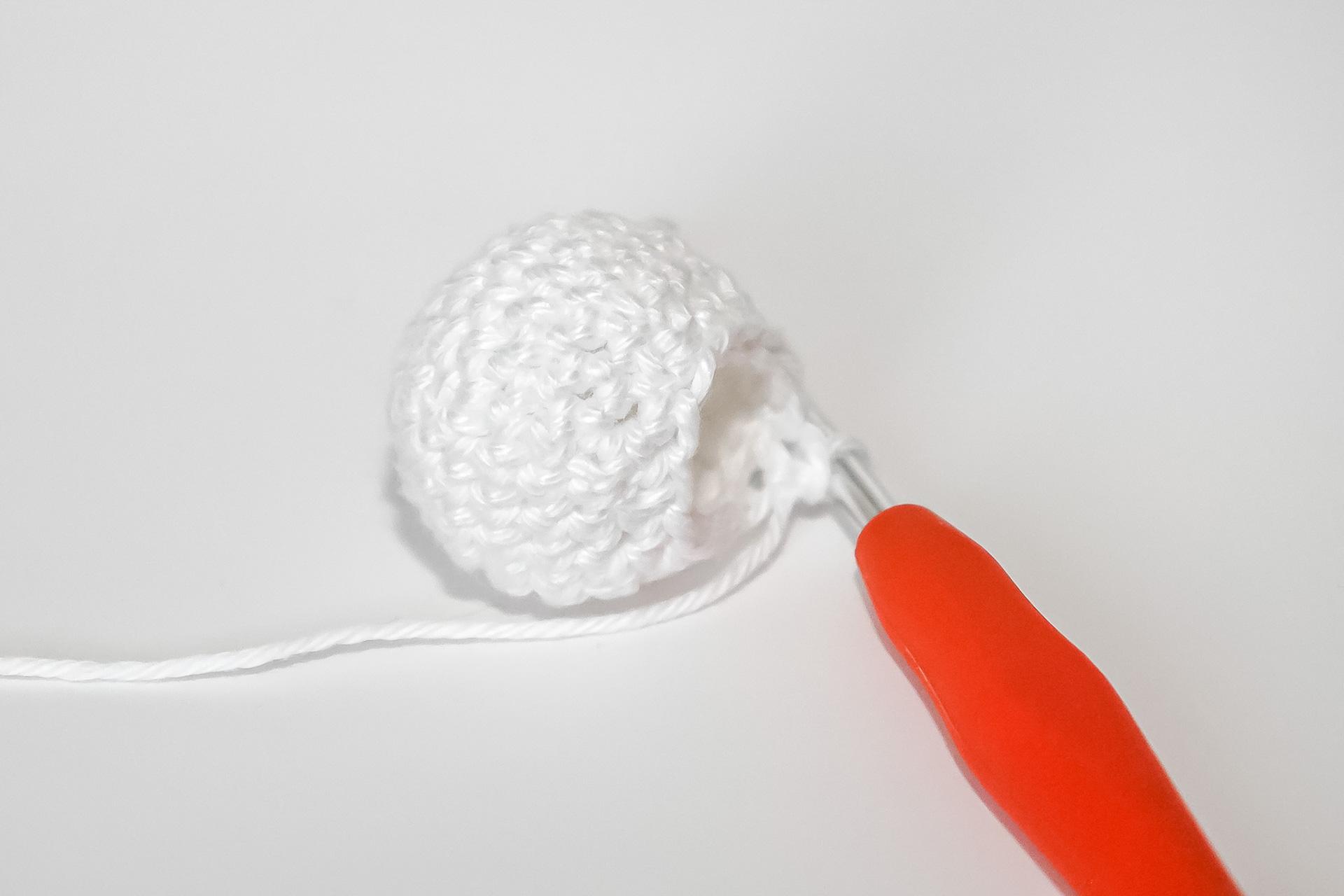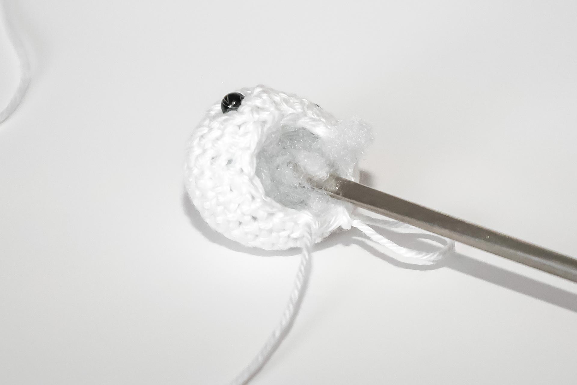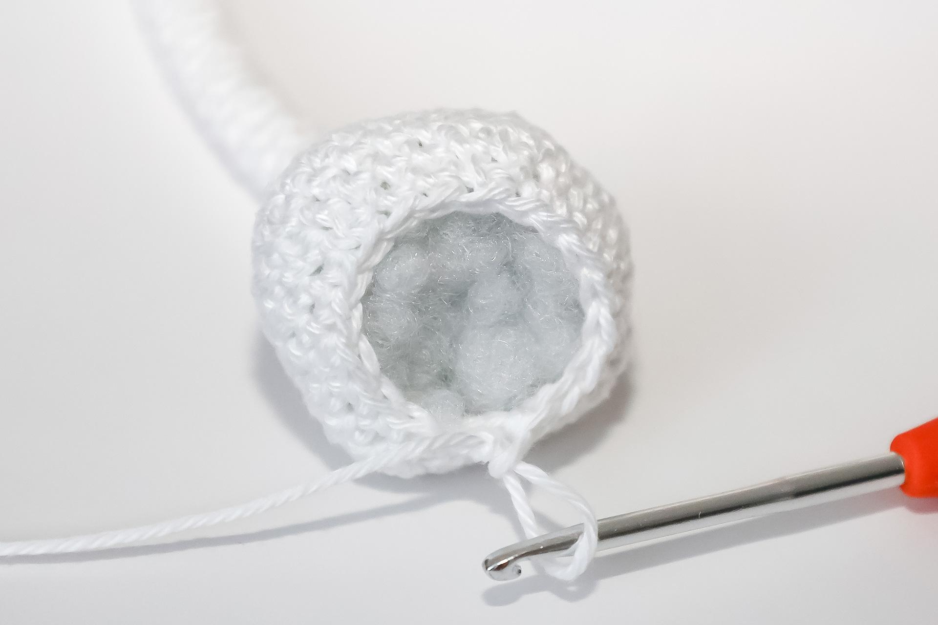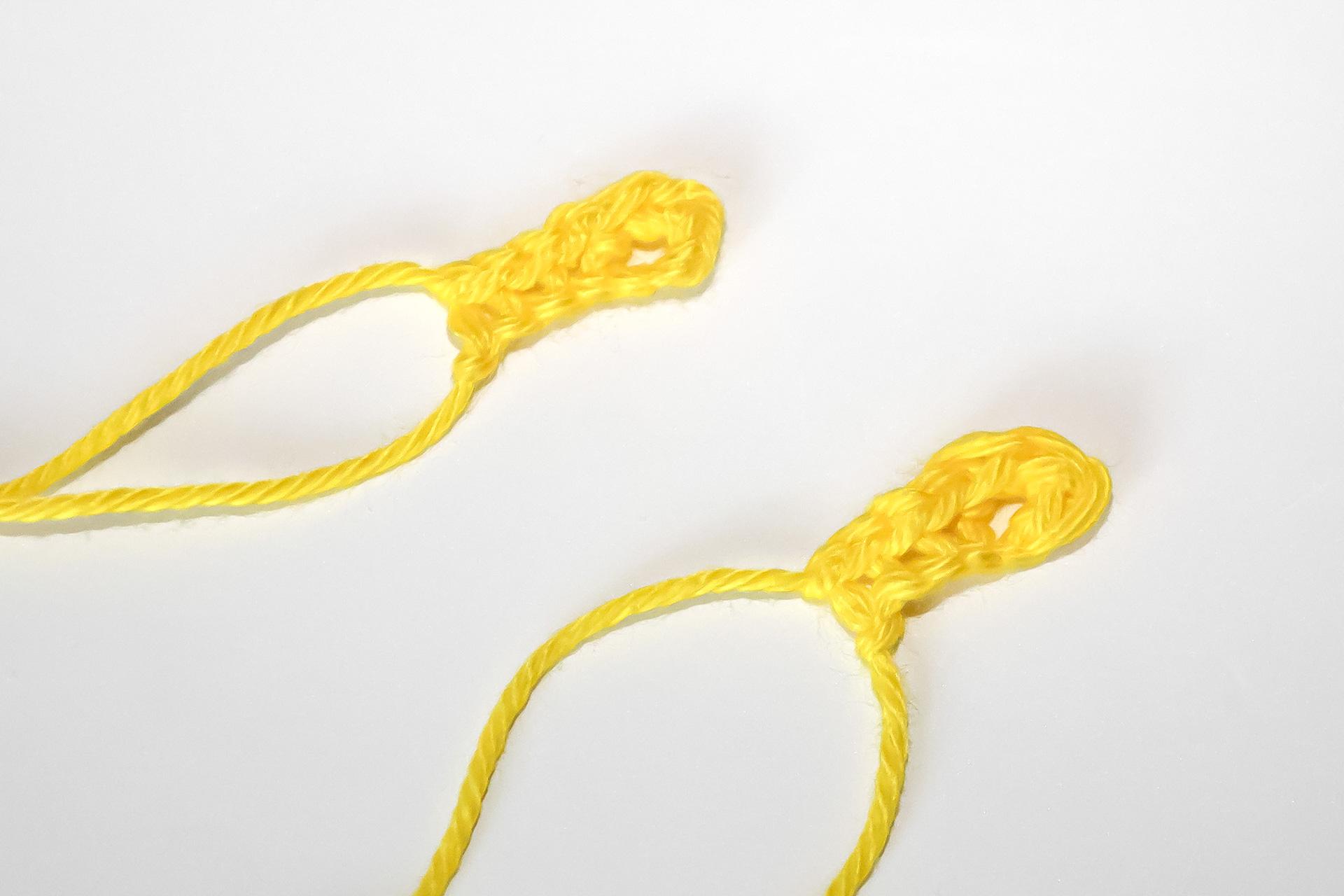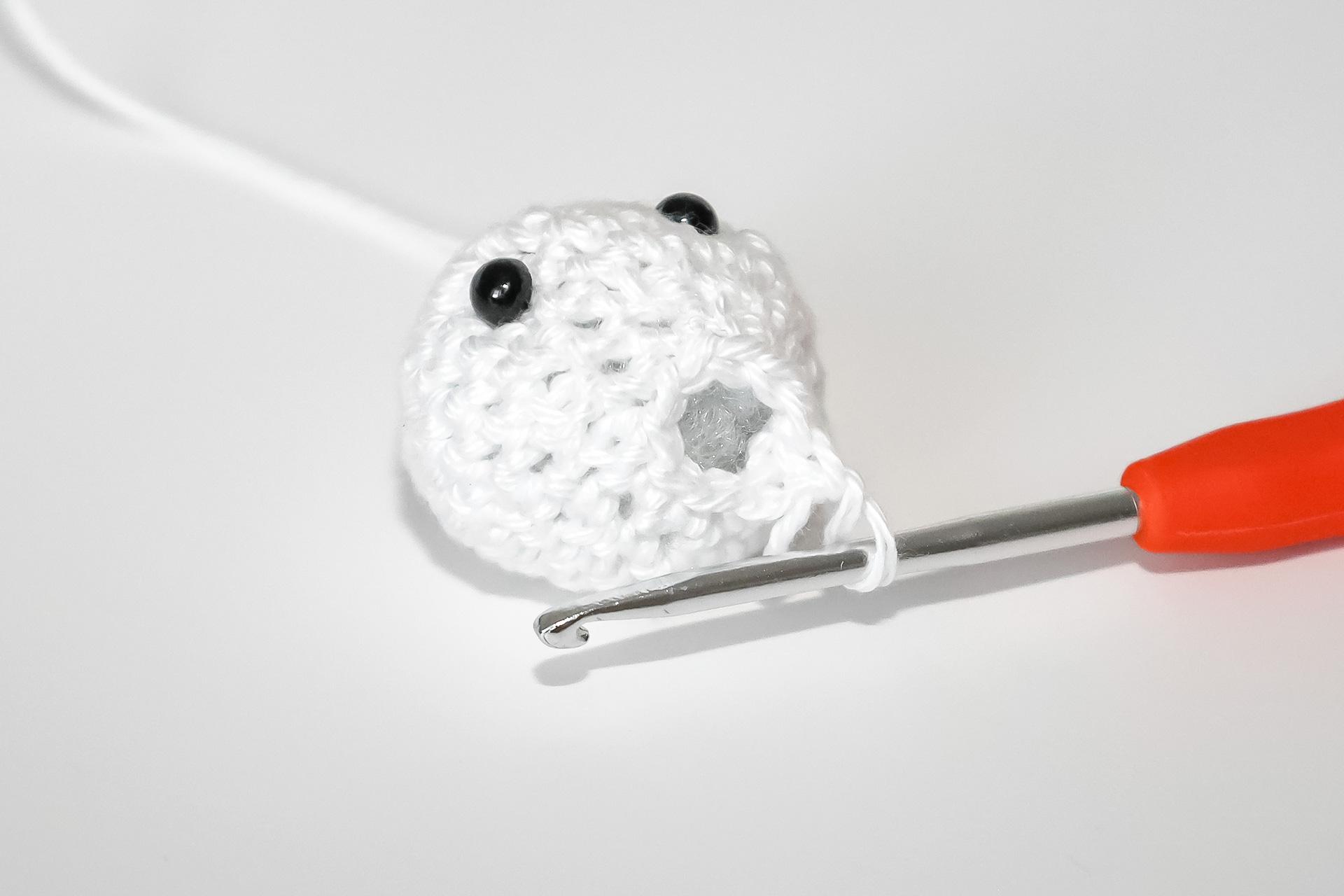37. Do druhého oka od háčku uháčkujeme 3KS do jednoho oka, dále 3PO, ukončíme a necháme delší přízi na přišití. Doděláme druhou nožku.