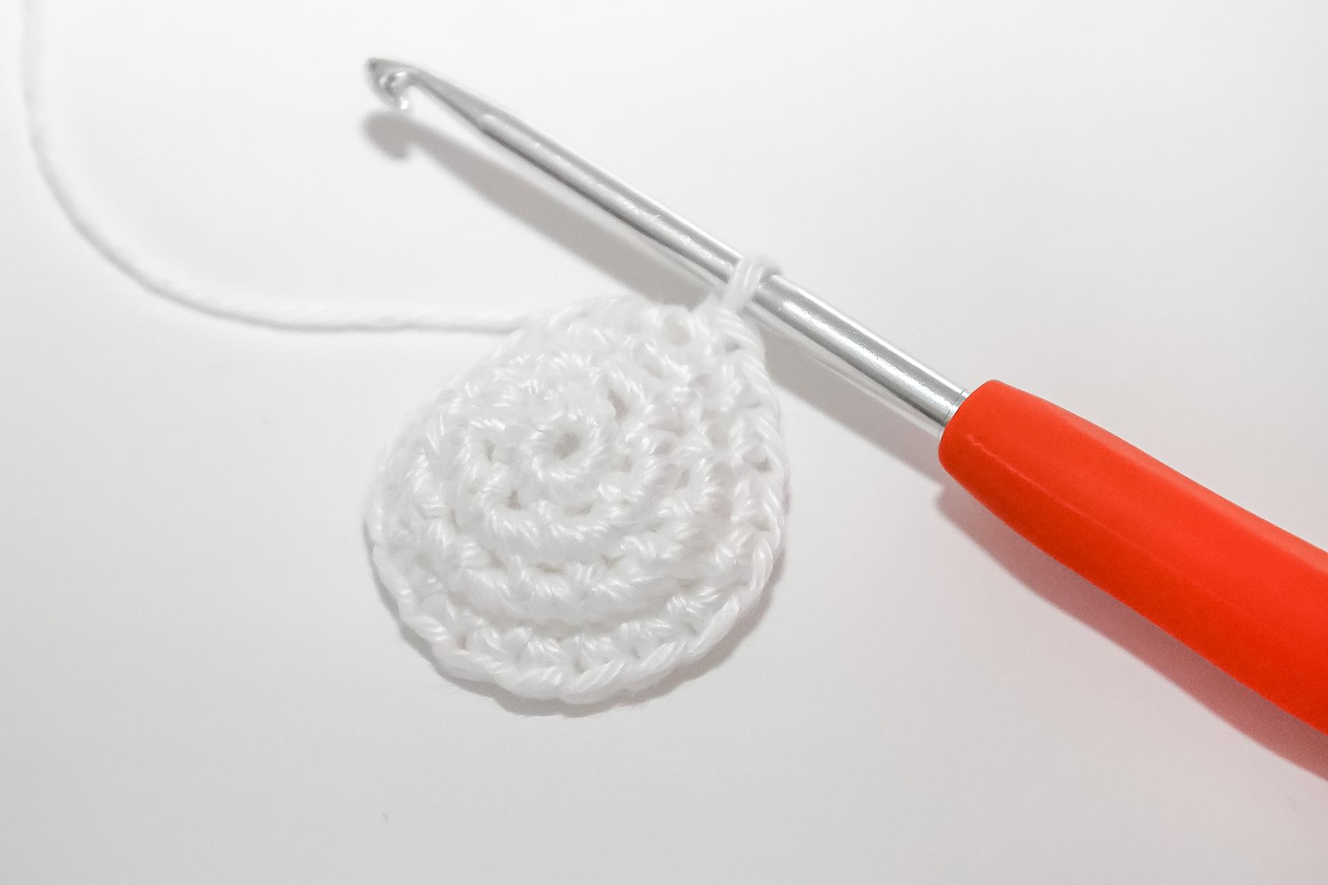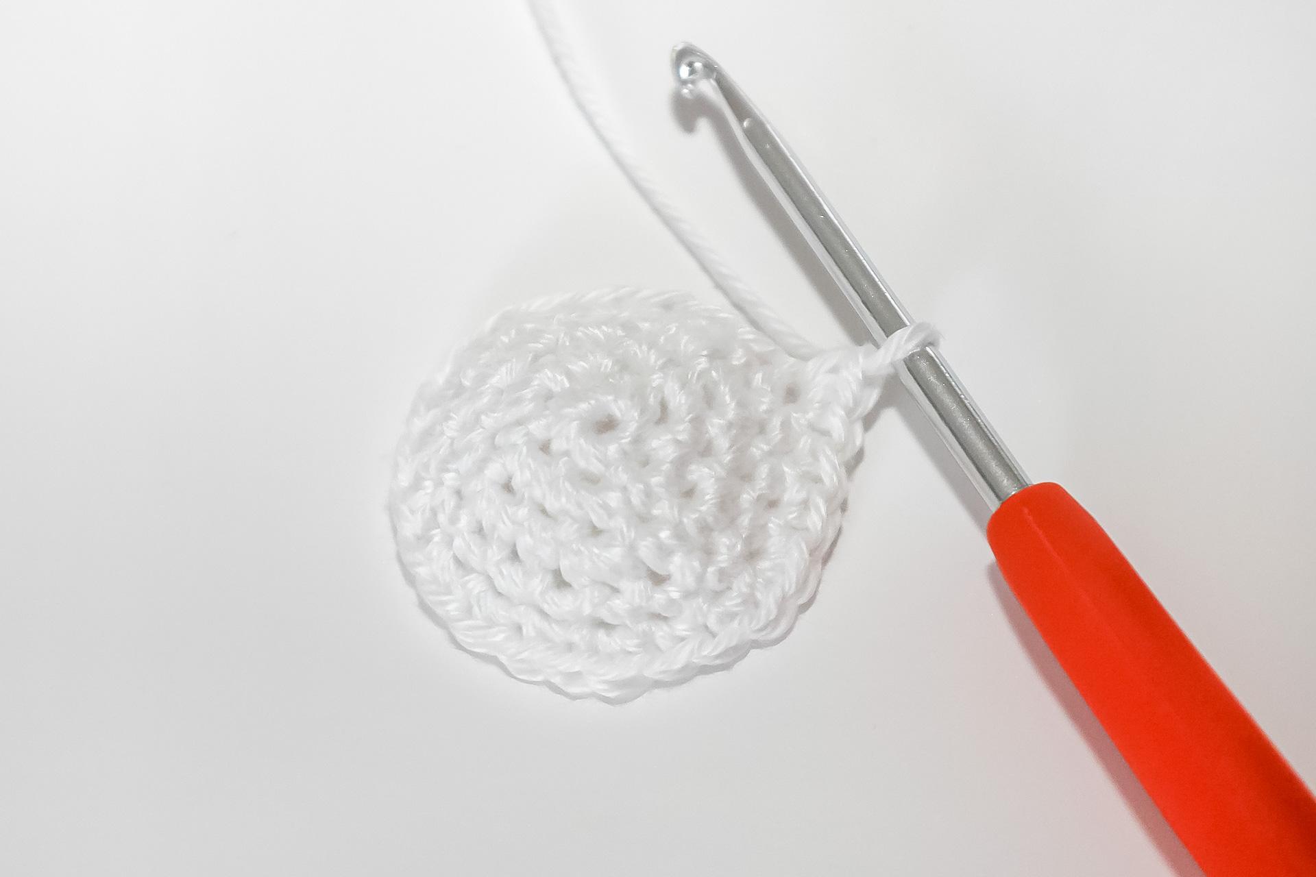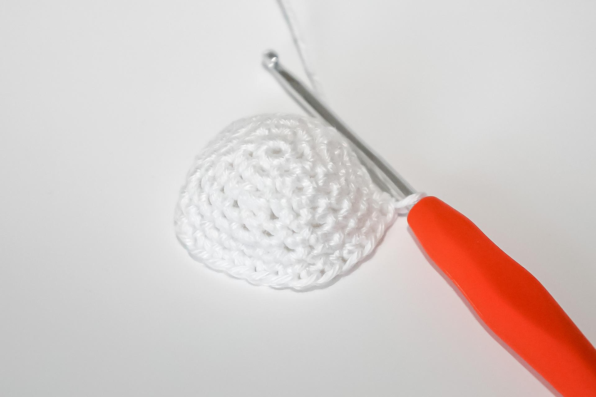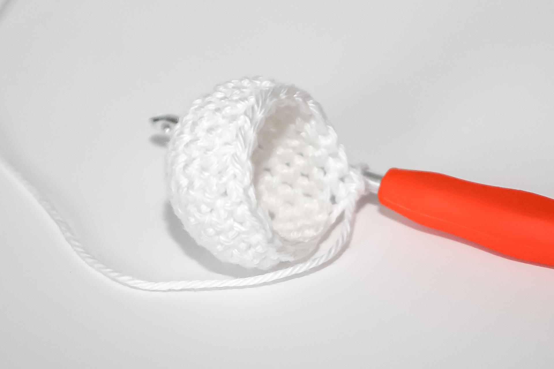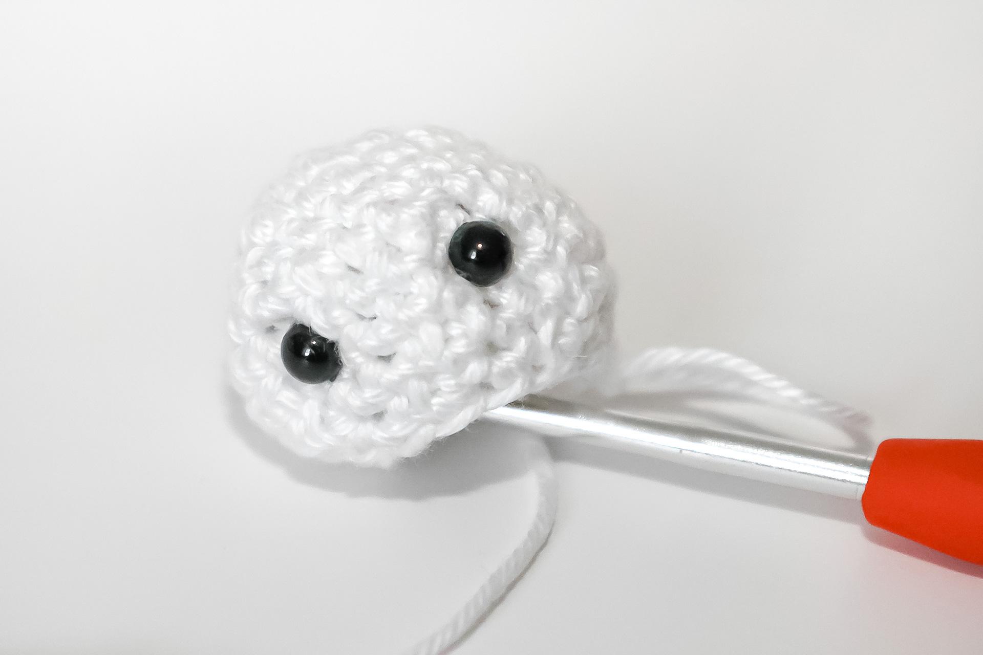 37. Do druhého oka od háčku uháčkujeme 3KS do jednoho oka, dále 3PO, ukončíme a necháme delší přízi na přišití. Doděláme druhou nožku.