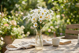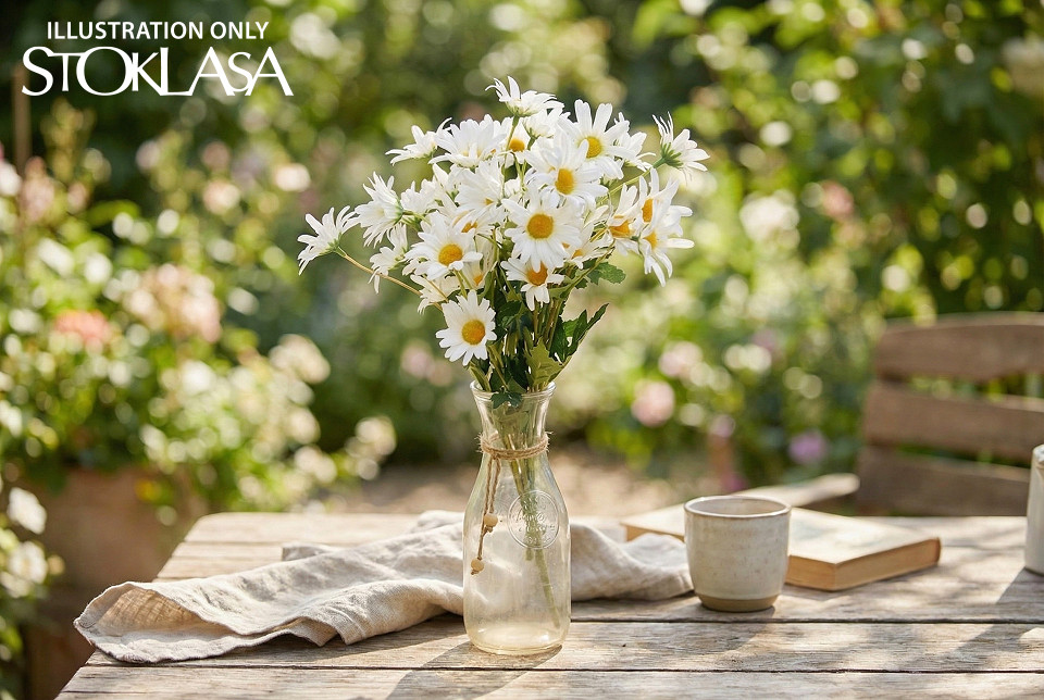 Umělá kytice kopretin vynikne ve váze, ale můžete také jednotlivé stonky pomocí kleští oddělit a zakomponovat do věnců, truhlíků, ikeban a různých květinových aranžmá. Uvnitř stonků jsou dráty. Květy a listy jsou textilní.