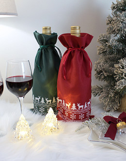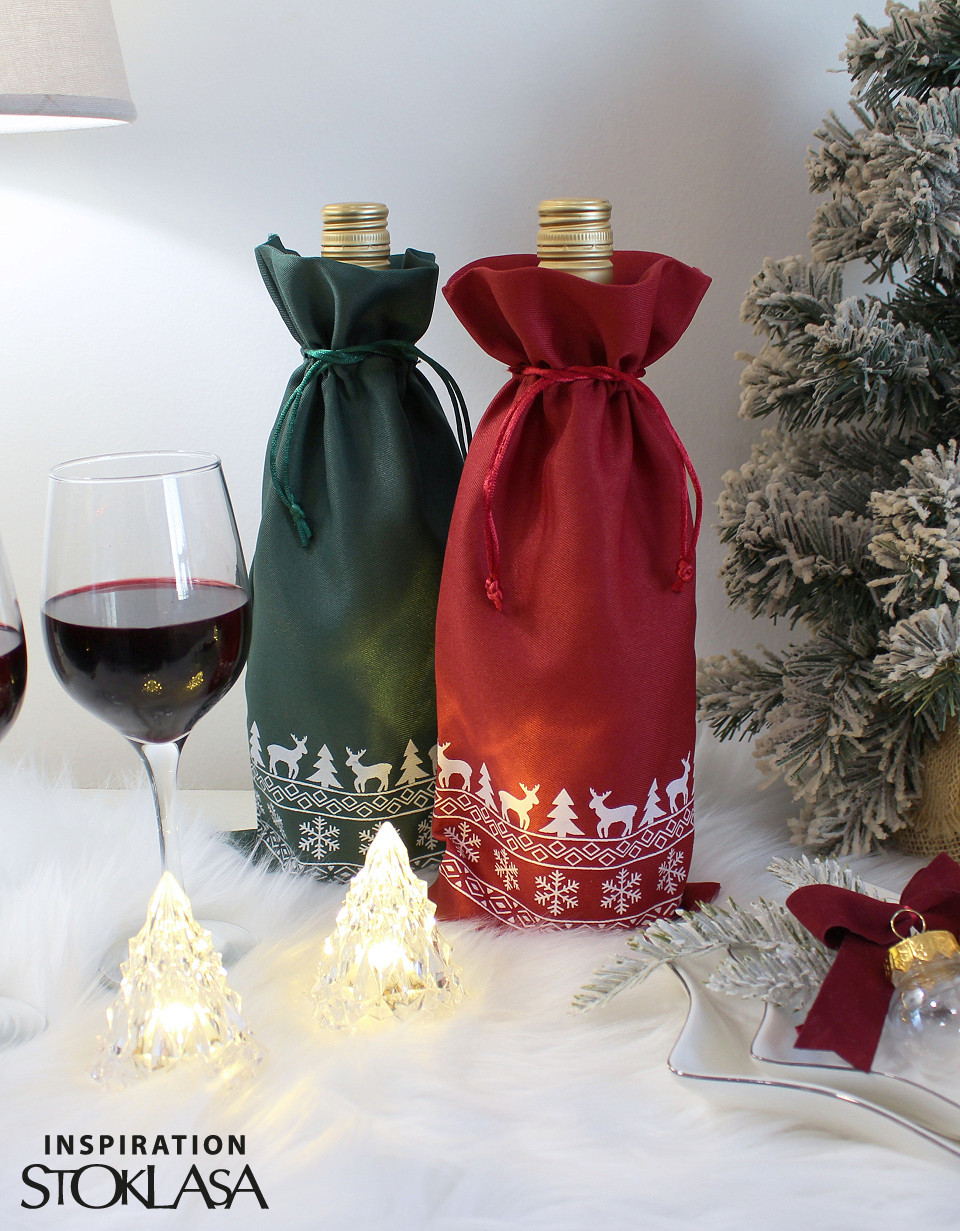 Vánoční dárkový pytlík je z obou stran ozdobený potiskem sobů, stromečků a vloček. Je určený na zabalení lahví a jiných podlouhlých dárků. Pytlík je dostatečně vysoký, ať už se rozhodnete pro dárek s alkoholem nebo s domácí limonádou, ušetří vám čas při balení. Stahuje se pomocí kulatých saténových šňůrek, dárku dodá osobní kouzlo a půvab. Láhev není součástí pytlíku.