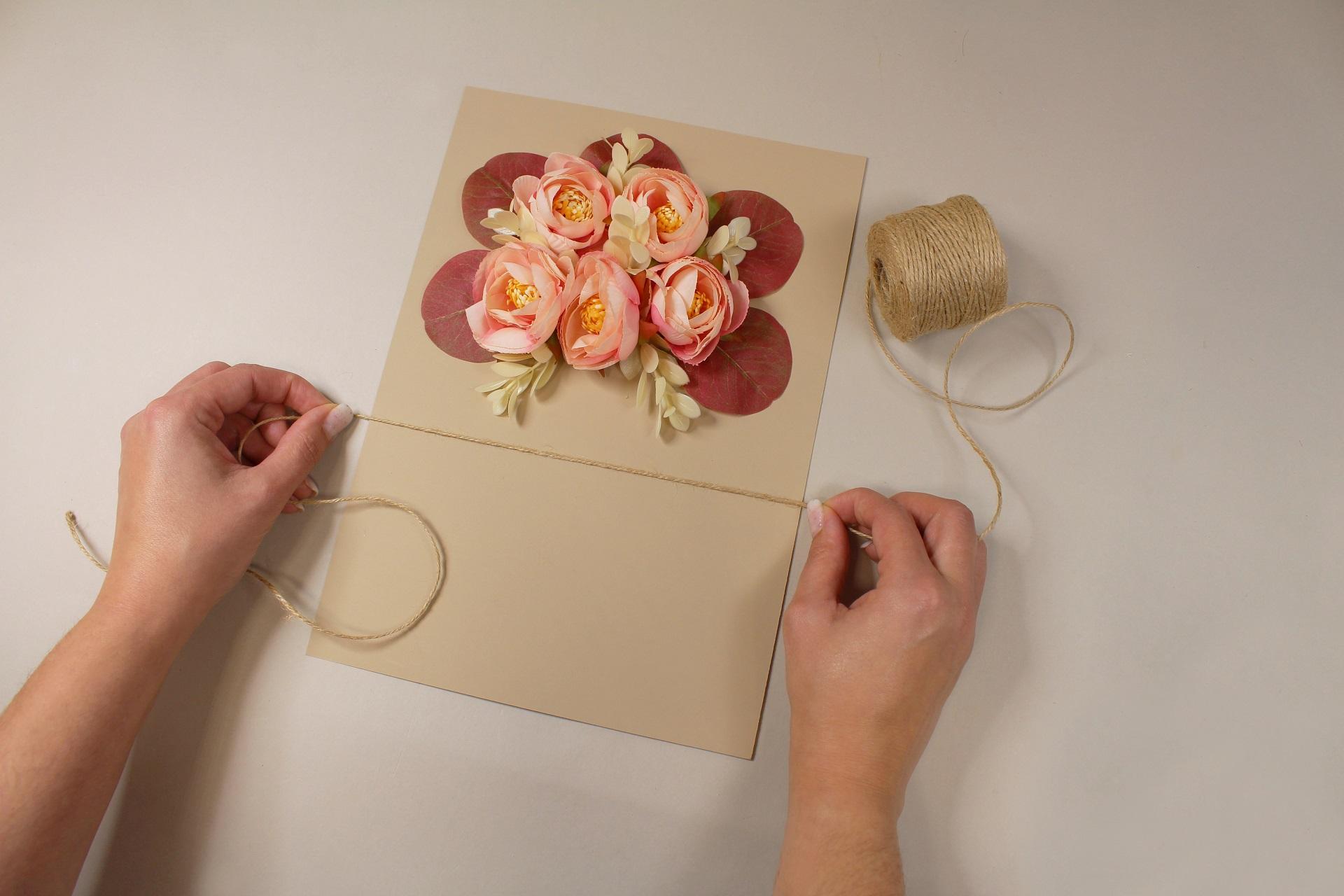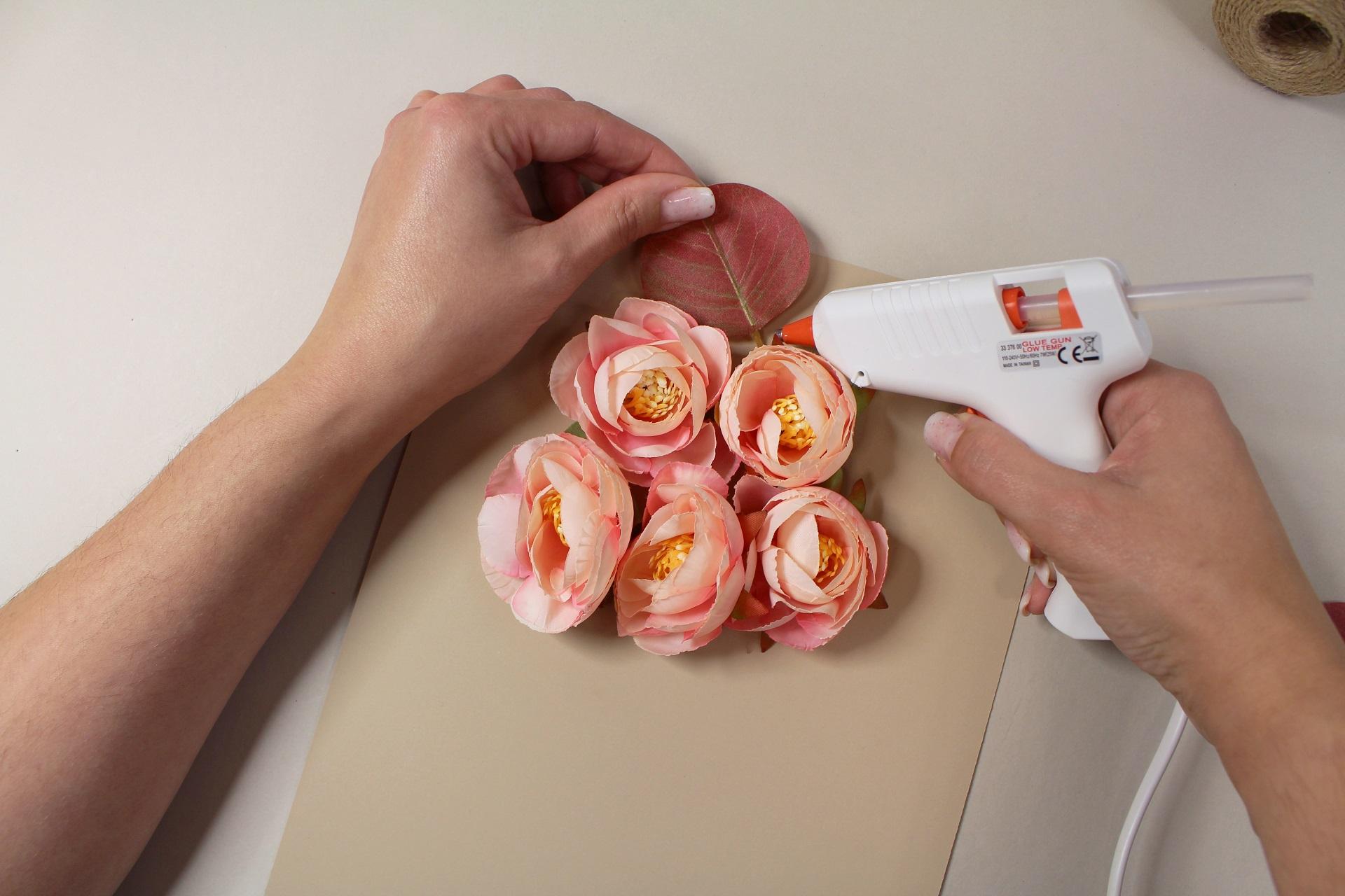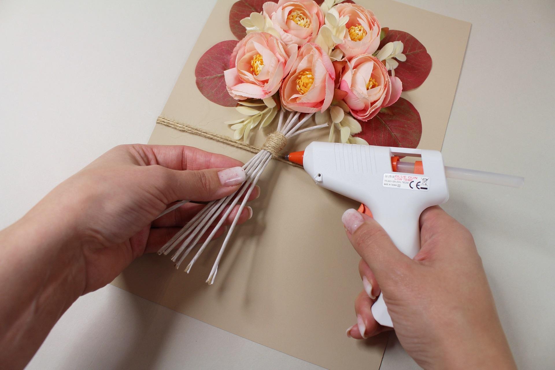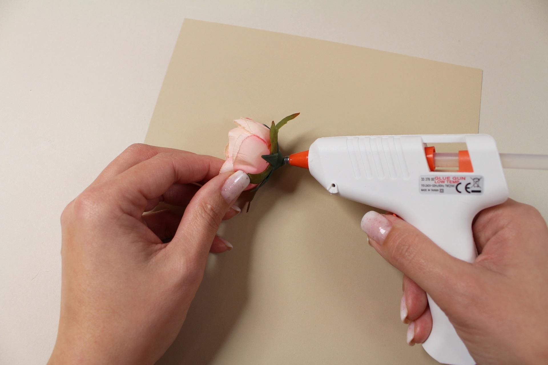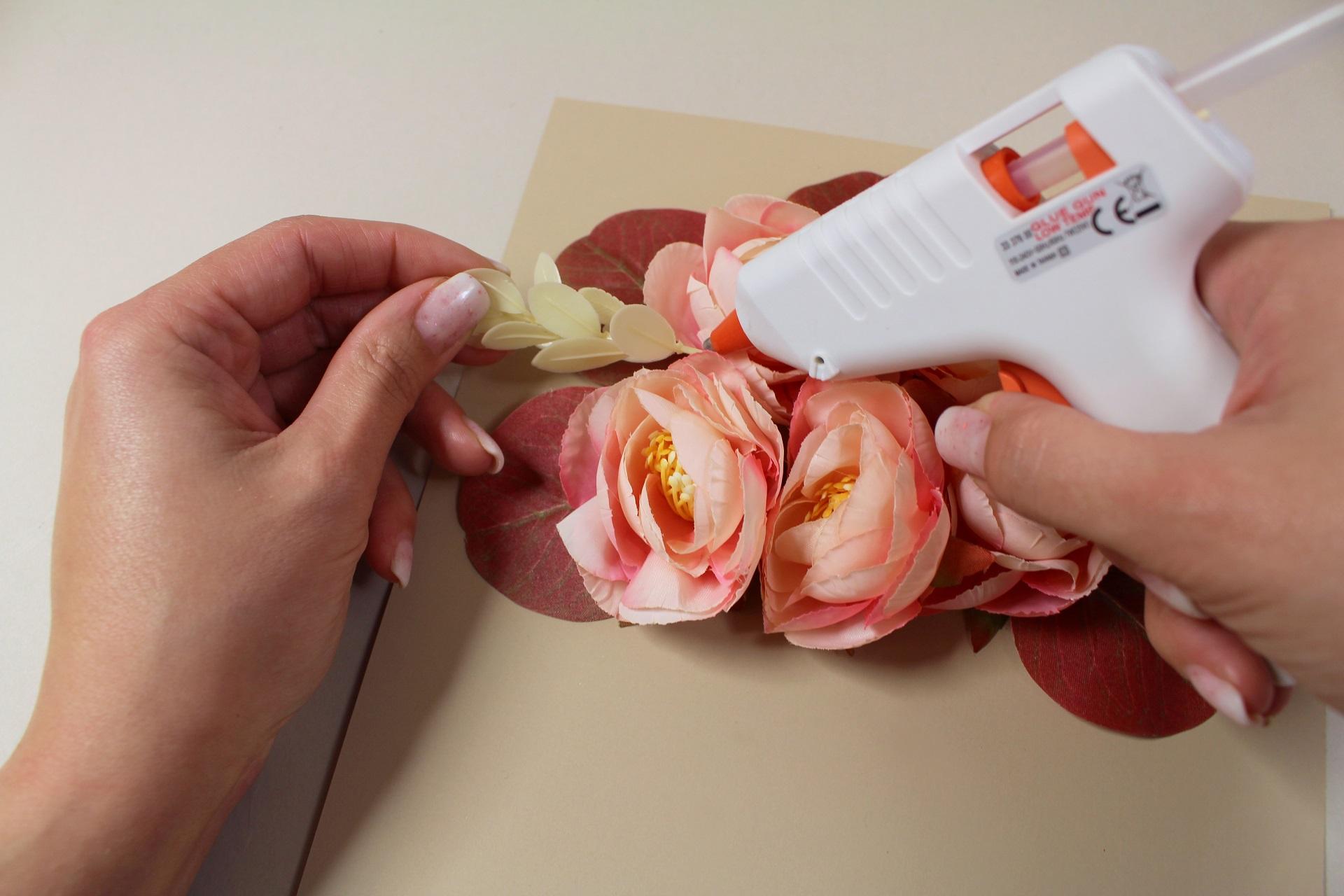 4. Na zadní stranu prvního květu naneseme tavné lepidlo a přilepíme jej na přední stranu předem připraveného přání.