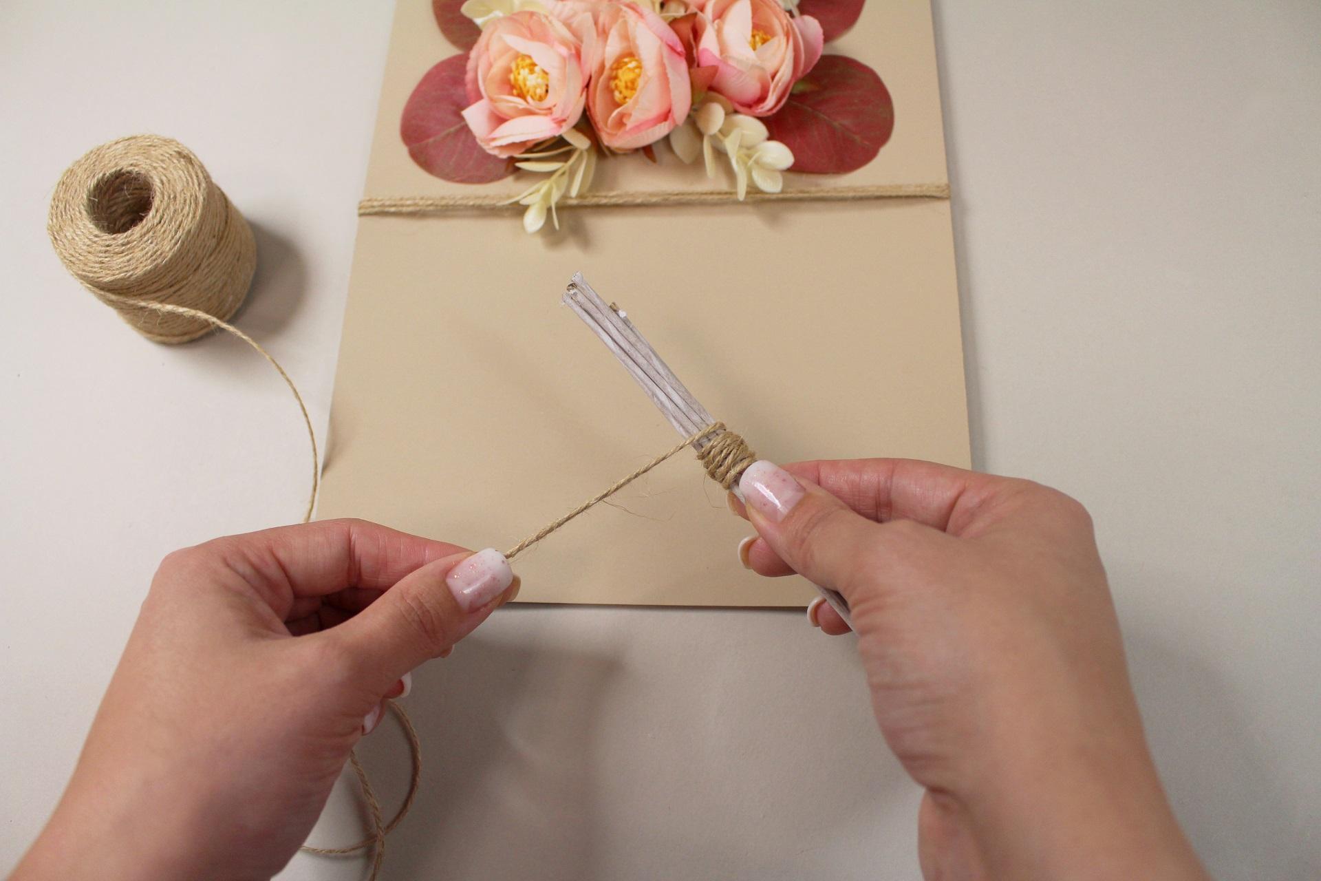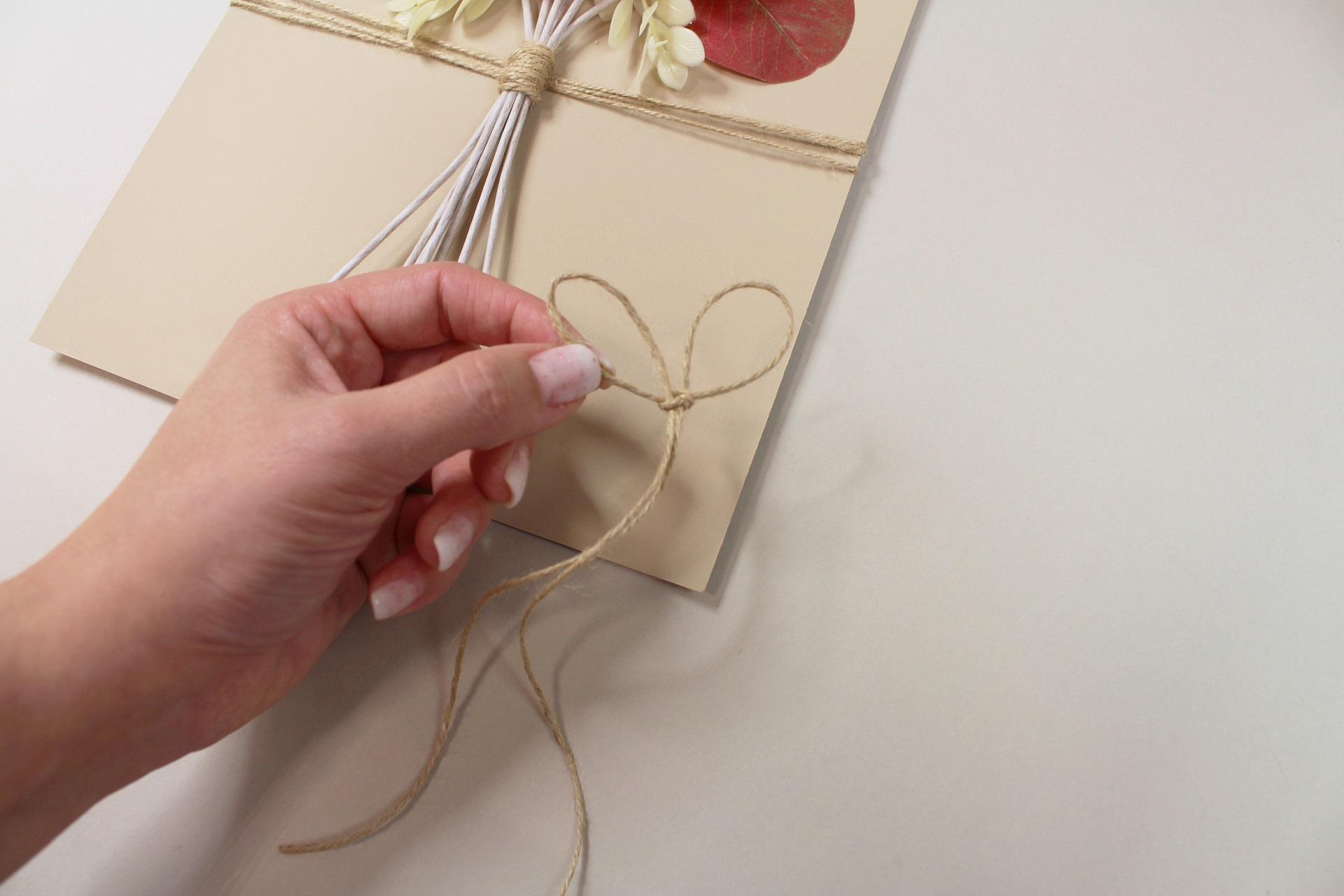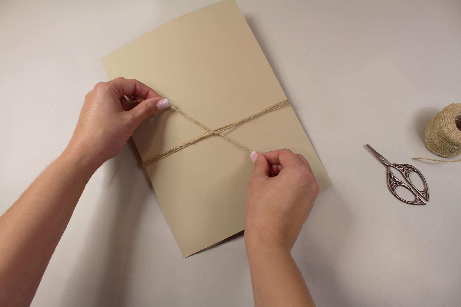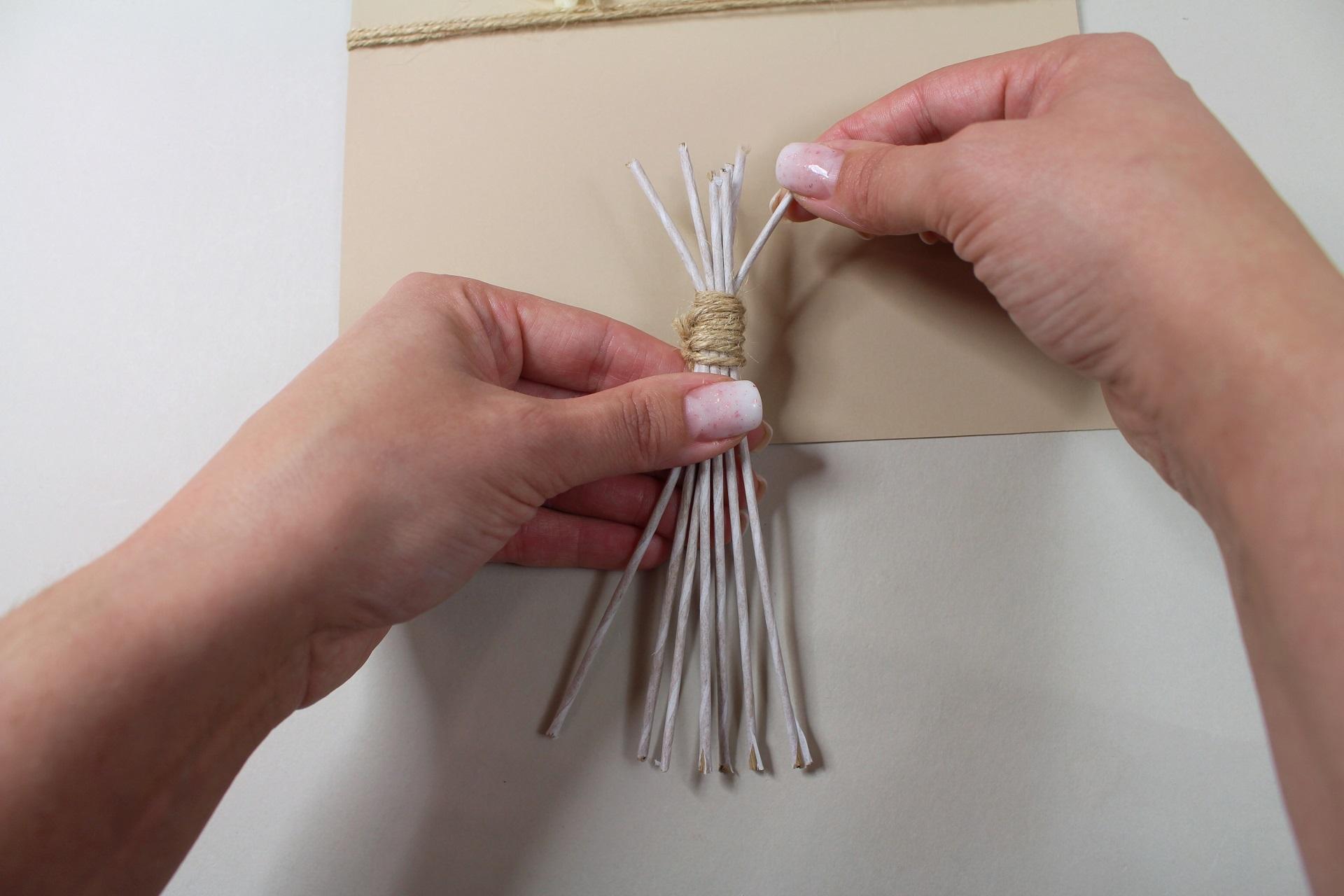 8. Provázek na zadní straně zauzlujeme nebo zajistíme tak, aby pevně držel. Přebytečný provázek odstřihneme.