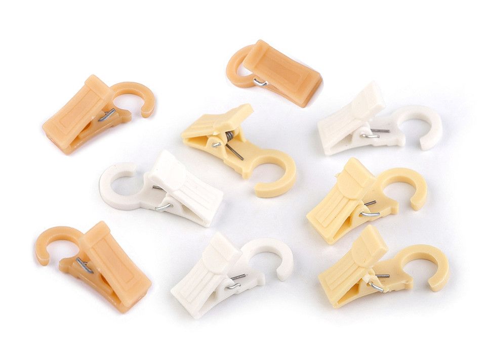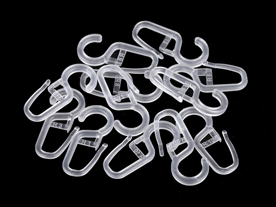 Háčky propojují řasící stuhu s garnýží nebo kolejničkou. I jejich výběr má vliv na komfort při používání i životnost záclon. Háčky se vkládají do oček řasící stuhy nebo do speciálních kapes, u žabek se látka uchycuje přímo. Rozestupy jsou dané samotnou stuhou nebo rozmístěním žabek, díky tomu je zavěšení vždy rovnoměrné. Přizpůsobte typ háčků nebo žabek druhu garnýže. Plastové háčky jsou ideální pro kolejničky s lehkými záclonami, kovové lépe drží těžké závěsy na tyči. A jaké druhy háčků a žabek si u nás můžete vybrat?